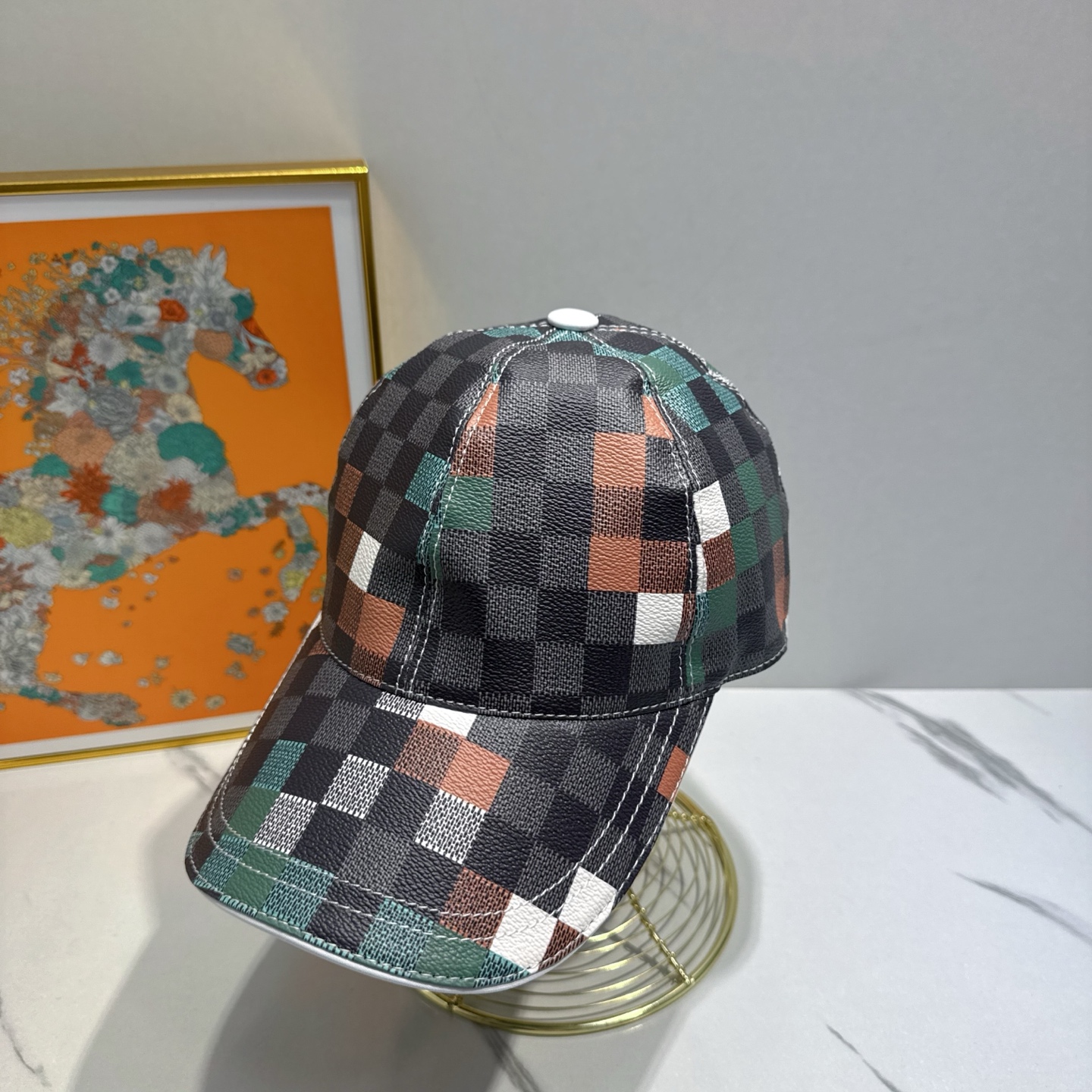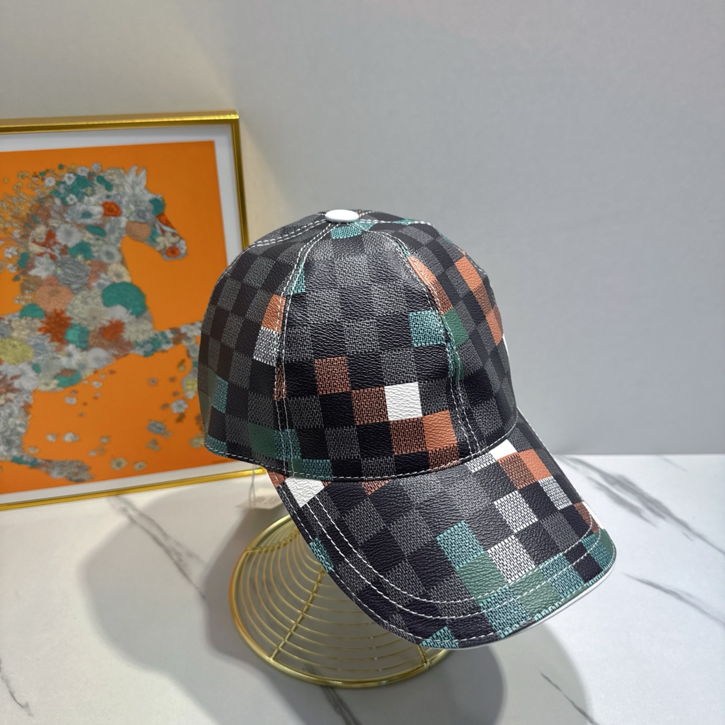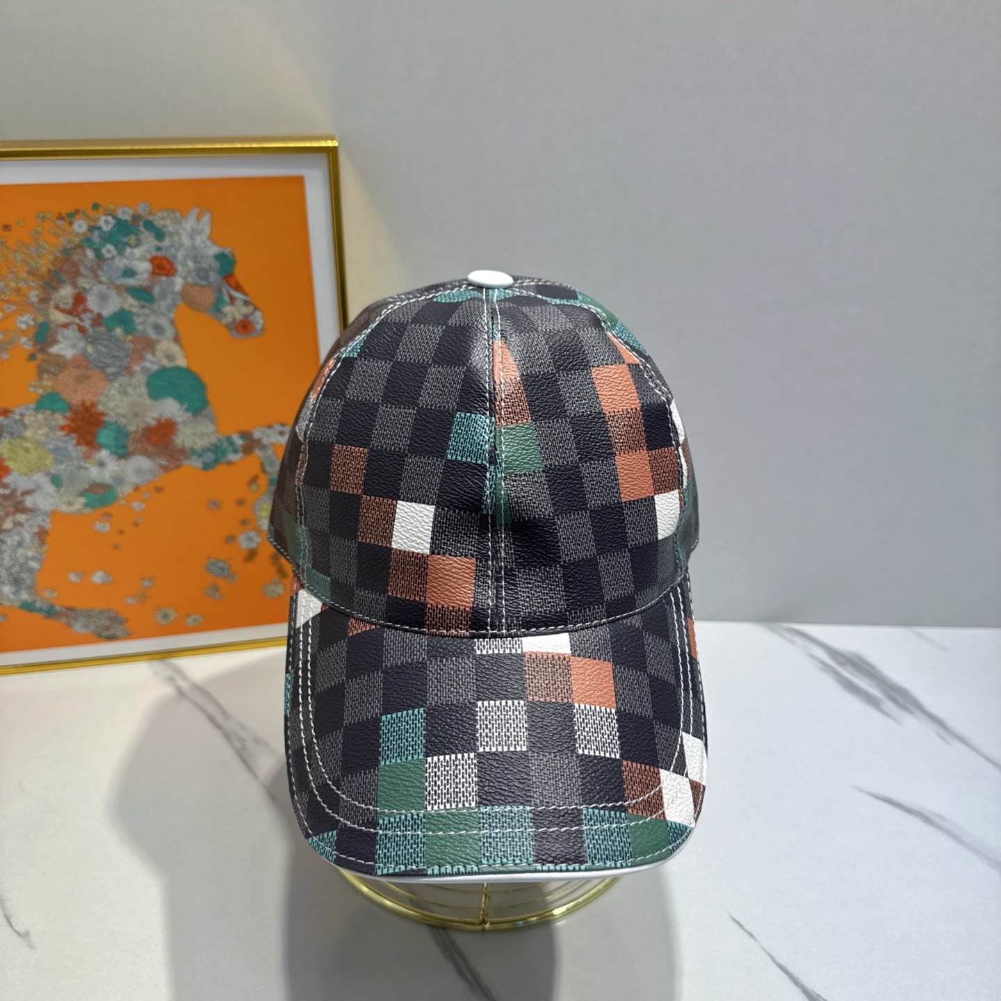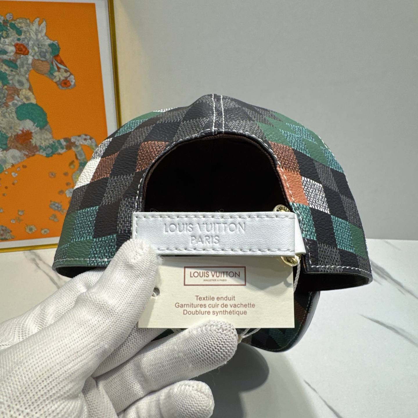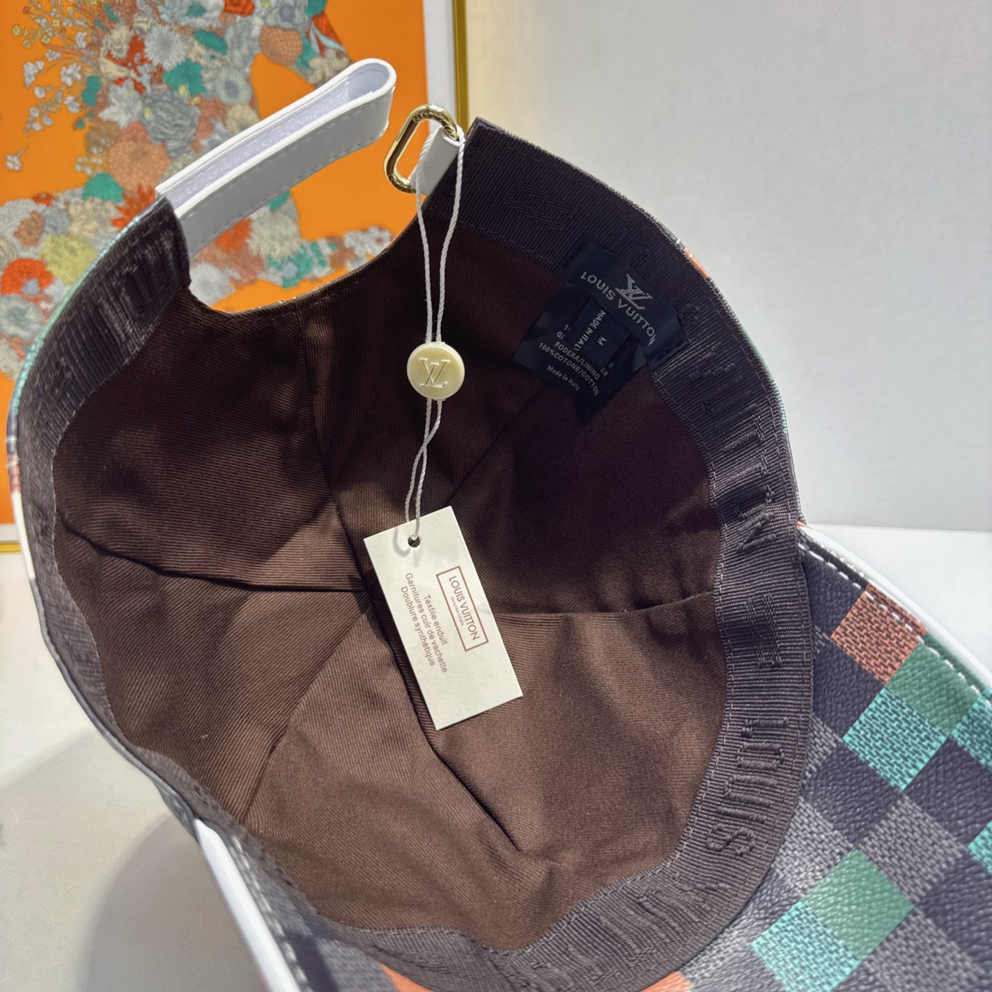 The cap's checkered pattern is meticulously crafted, with each square precisely aligned to create a seamless and visually stunning effect. The colors are carefully chosen to complement each other, resulting in a harmonious and eye-catching design. The subtle Louis Vuitton branding adds a touch of exclusivity, making it a coveted accessory for fashion enthusiasts.