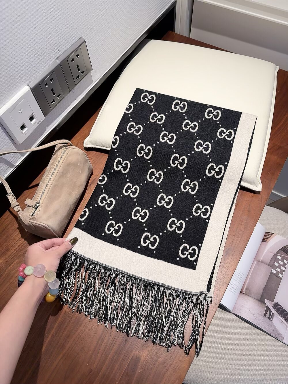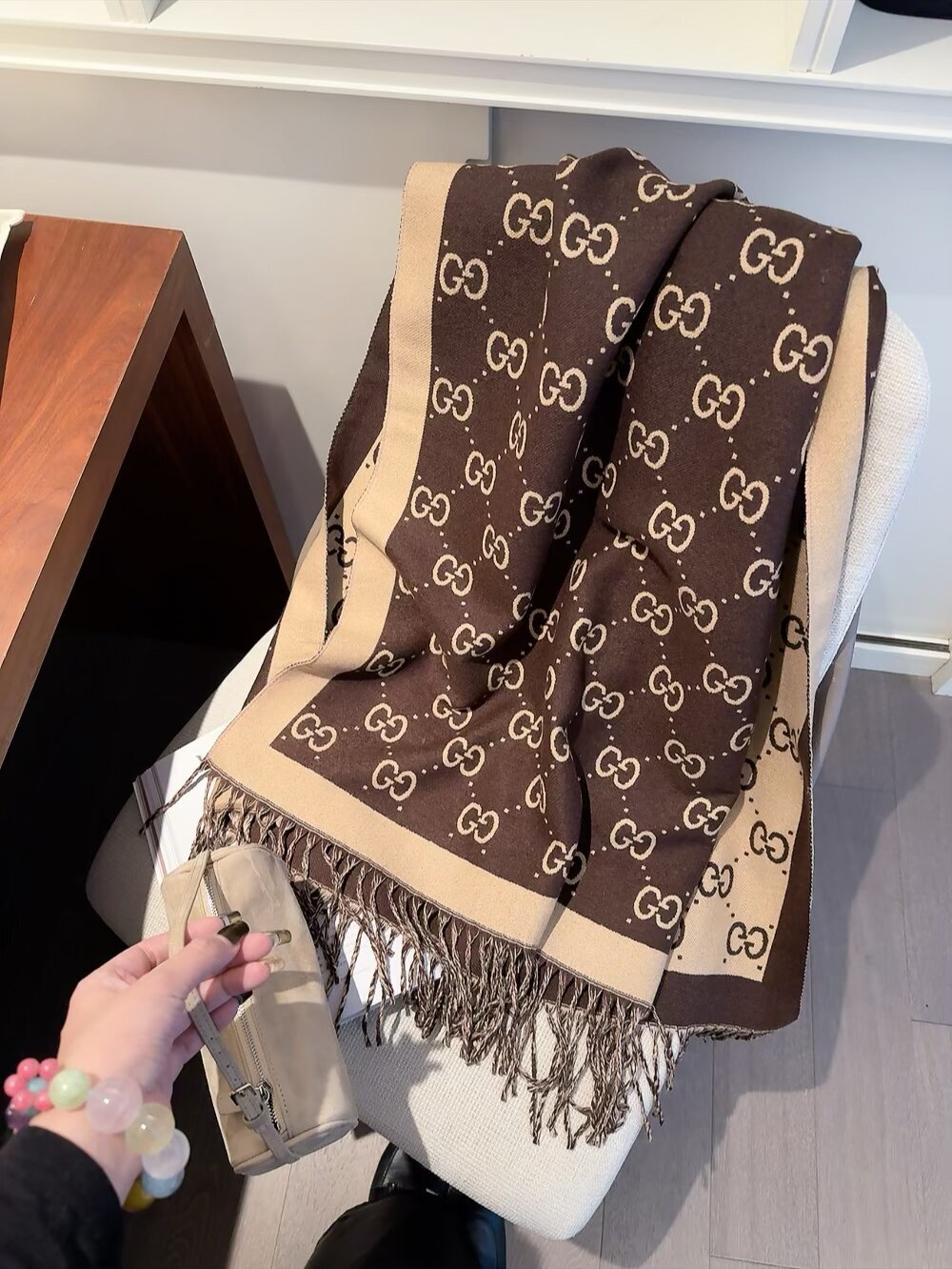 Add a touch of luxury to your handbag by tying the Gucci Black & White GG Wool Scarf around the handle. This unexpected styling trick instantly elevates your bag and adds a pop of visual interest. Coordinate the scarf with your outfit for a cohesive and polished look.