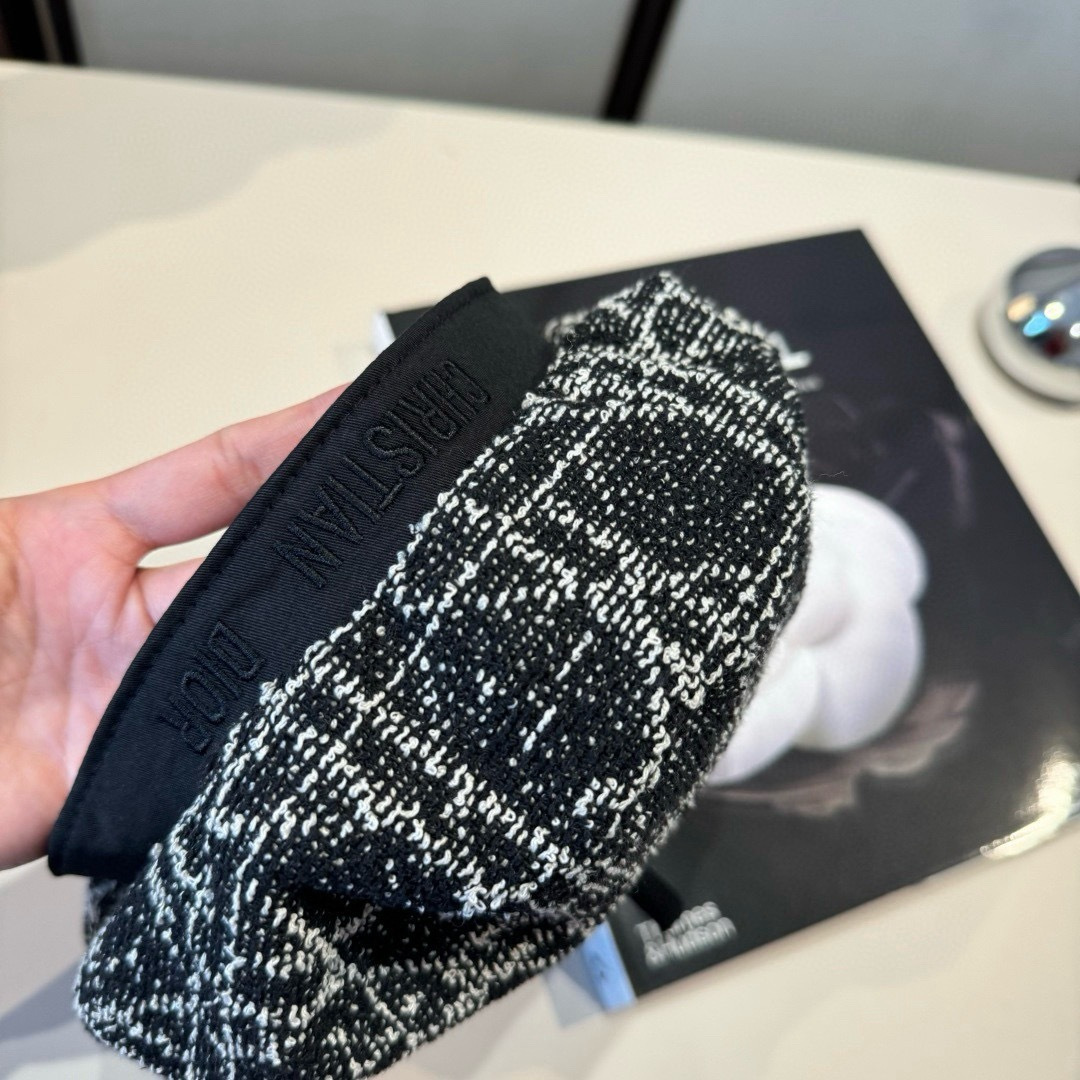 designer headwear Dior Black & White Tweed Beret - Elevate your style with the timeless elegance of the Dior Black & White Tweed Beret. This exquisite beret seamlessly blends classic design with modern sophistication, making it the perfect accessory for any fashion-forward individual. Crafted from high-quality tweed, this beret showcases a striking black and white pattern that adds a touch of Parisian chic to your wardrobe. Whether you're strolling through the city streets or attending a stylish event, the Dior Black & White Tweed Beret is sure to turn heads and make a statement.