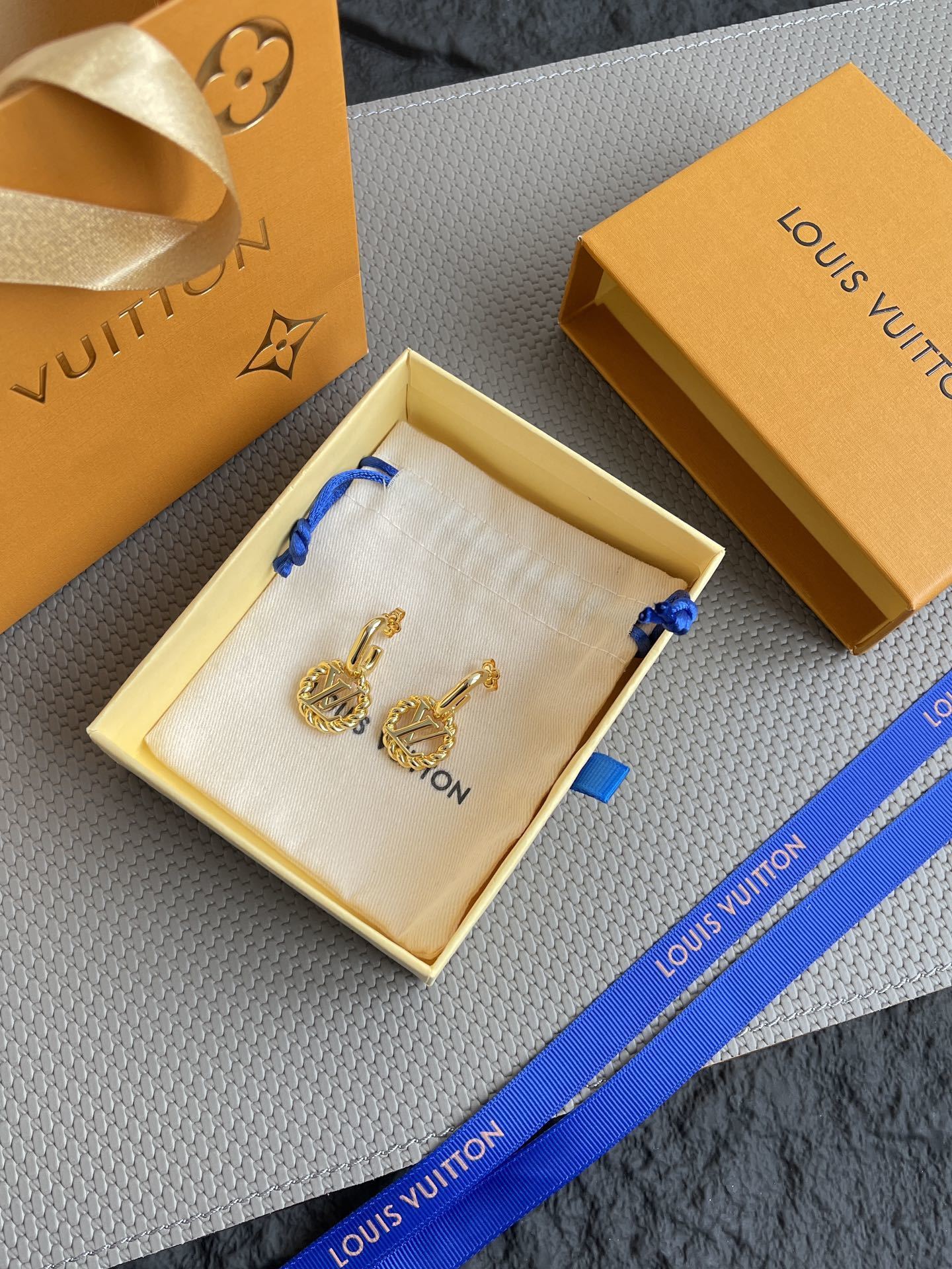 The central LV logo is intricately designed, showcasing the brand's commitment to excellence. The nautical rope detailing adds a touch of texture and visual interest, making these earrings truly stand out. These earrings are also hypoallergenic, making them suitable for those with sensitive skin. The secure clasp ensures they stay in place, providing peace of mind while you wear them.