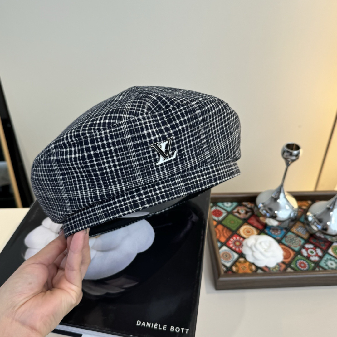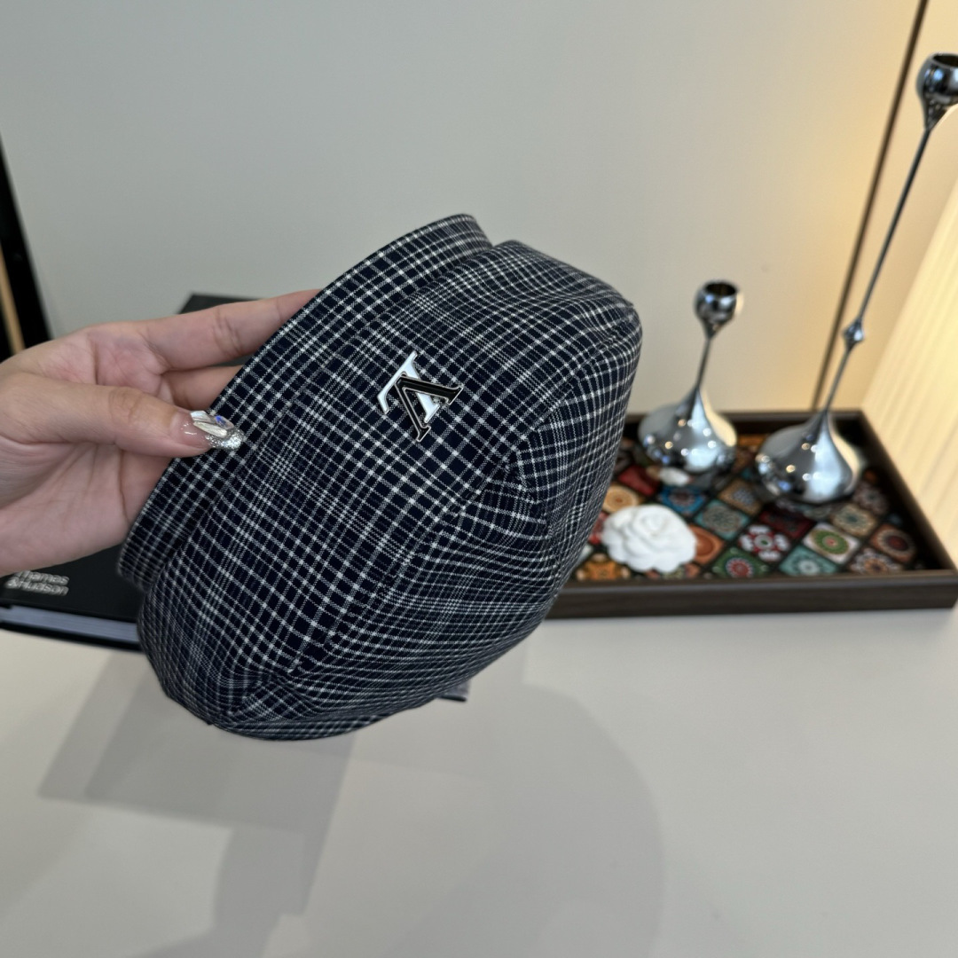 designer newsboy Louis Vuitton Plaid Beret - Elevate your style with the timeless elegance of the Louis Vuitton Plaid Beret. This chic accessory seamlessly blends classic design with the iconic luxury of Louis Vuitton, making it a must-have for fashion enthusiasts. Crafted with meticulous attention to detail, this beret exudes sophistication and adds a touch of Parisian flair to any ensemble. The distinctive plaid pattern, combined with the subtle yet recognizable LV logo, showcases the brand's commitment to quality and style. Whether you're strolling through city streets or attending a social gathering, the Louis Vuitton Plaid Beret is the perfect finishing touch to express your impeccable taste.