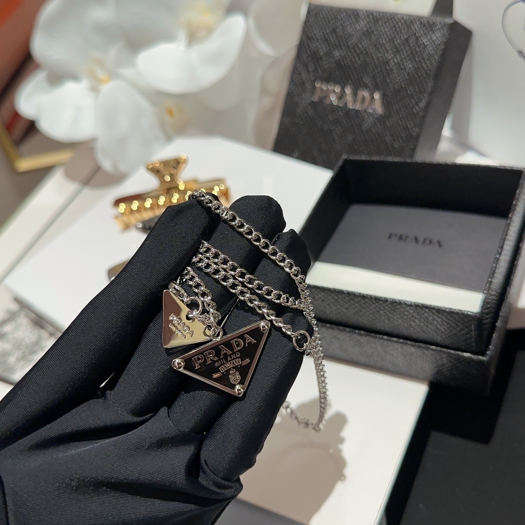 designer Prada Silver Triangle Logo Necklace - Elevate your style with the iconic Prada Silver Triangle Logo Necklace, a statement piece that embodies modern luxury and sophistication. This necklace features the signature Prada triangle logo pendant, crafted from high-quality silver, making it a versatile accessory that complements any outfit. The sleek design and impeccable craftsmanship make it a must-have for fashion enthusiasts and collectors alike. Whether you're dressing up for a special occasion or adding a touch of elegance to your everyday look, the Prada Silver Triangle Logo Necklace is the perfect choice.