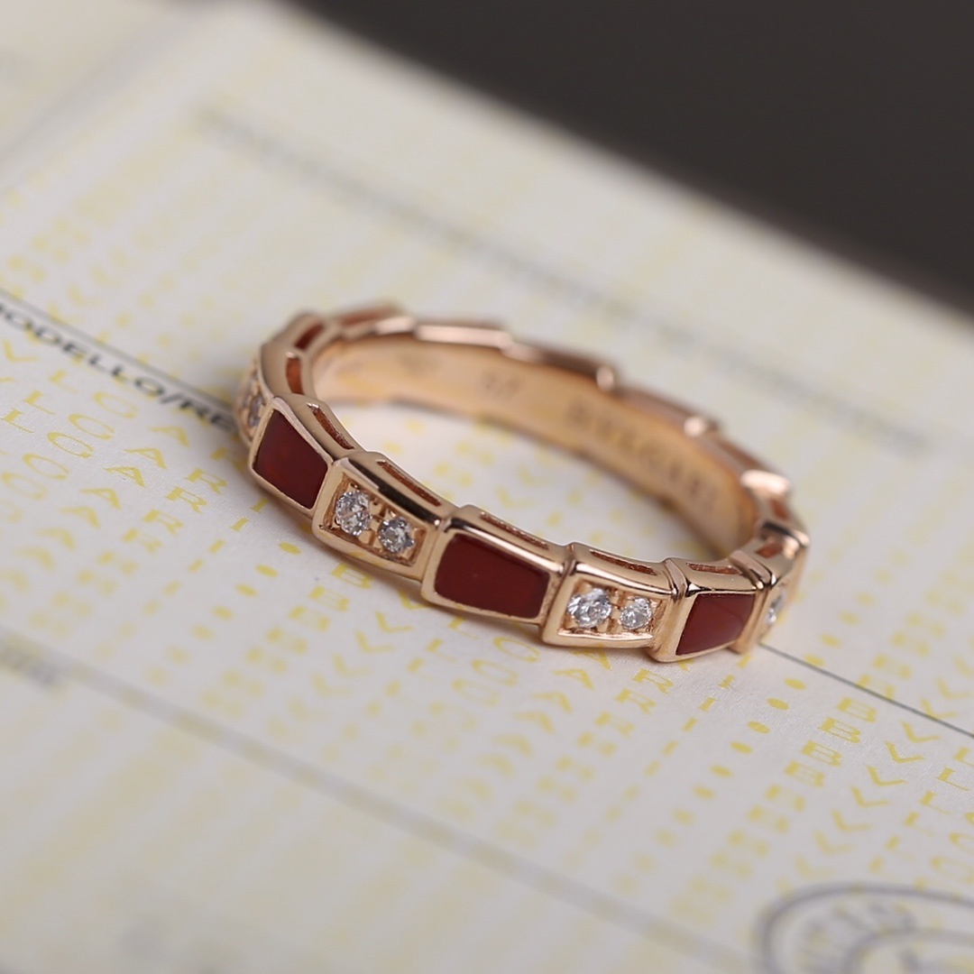 diamond Bvlgari Rose Gold Red Ceramic Ring - The Bvlgari Rose Gold Red Ceramic Ring is a stunning piece of jewelry that effortlessly blends luxury and modern design. This exquisite ring features a beautiful combination of rose gold, vibrant red ceramic, and sparkling diamond accents, making it a perfect statement piece for any occasion. The ring’s unique design and high-quality materials ensure it stands out, adding a touch of sophistication and elegance to your style. Whether you are looking for a special gift or a treat for yourself, the Bvlgari Rose Gold Red Ceramic Ring is an excellent choice. The ring's distinctive aesthetic captures the essence of Bvlgari's renowned craftsmanship and innovative spirit, making it a valuable addition to any jewelry collection. This piece is more than just an accessory; it's an emblem of luxury, style, and refined taste, promising to elevate your look with its unique charm.