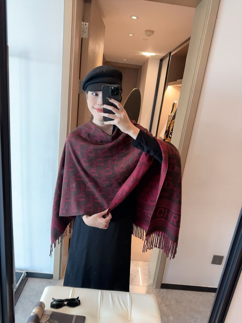 A: The Dior Brown Logo Wool Shawl measures approximately 55 inches wide by 70 inches long, providing ample coverage and versatile styling options.