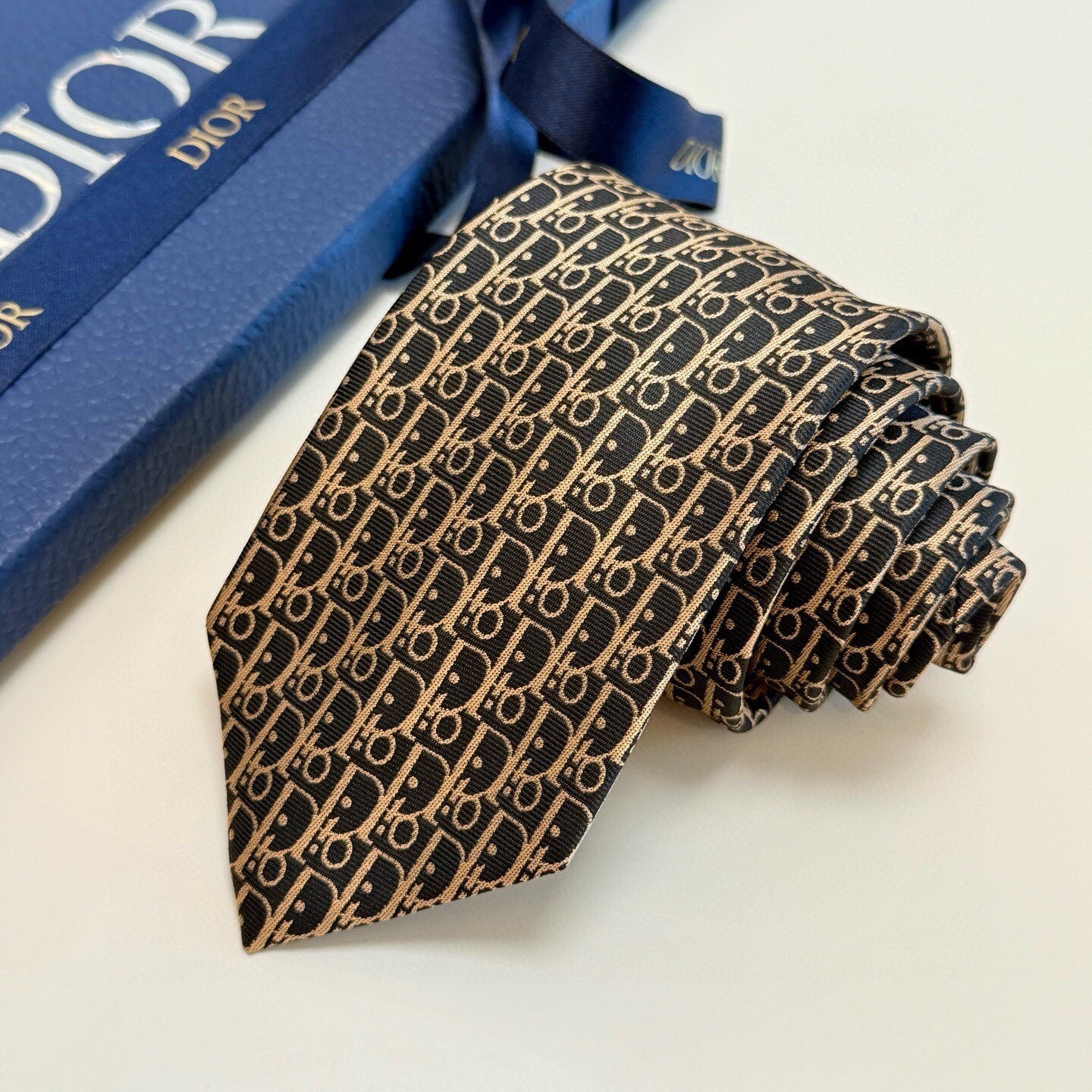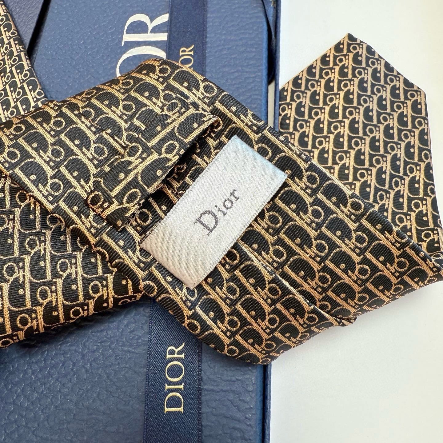 The Dior Oblique Silk Tie in Black & Beige is available in our store collection. Don't miss the opportunity to add this exquisite piece to your wardrobe.