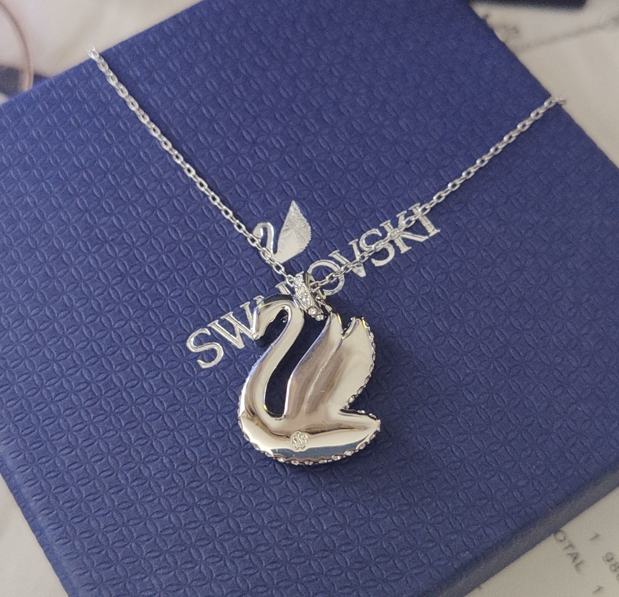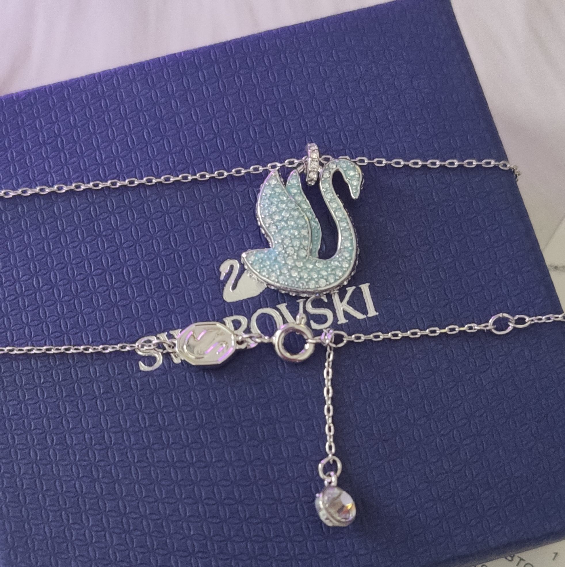 elegant Swarovski Silver Swan Blue Crystal Necklace - The Swarovski Silver Swan Blue Crystal Necklace is an exquisite piece of jewelry that captures the grace and beauty of a swan. This stunning necklace features a delicate silver chain adorned with a dazzling swan pendant, meticulously embellished with sparkling blue crystals. It's more than just an accessory; it's a statement of elegance, sophistication, and timeless beauty. The intricate design and shimmering crystals make it a perfect addition to any jewelry collection, suitable for both casual and formal occasions. The Swarovski Silver Swan Blue Crystal Necklace is designed to reflect light beautifully, ensuring that you shine wherever you go. The pendant is crafted with precision, capturing the fluid lines and graceful curves of a swan in flight. The blue crystals add a touch of color and whimsy, making it a standout piece that is sure to draw attention. This necklace is not only visually stunning but also durable and long-lasting, thanks to the high-quality materials used in its construction.