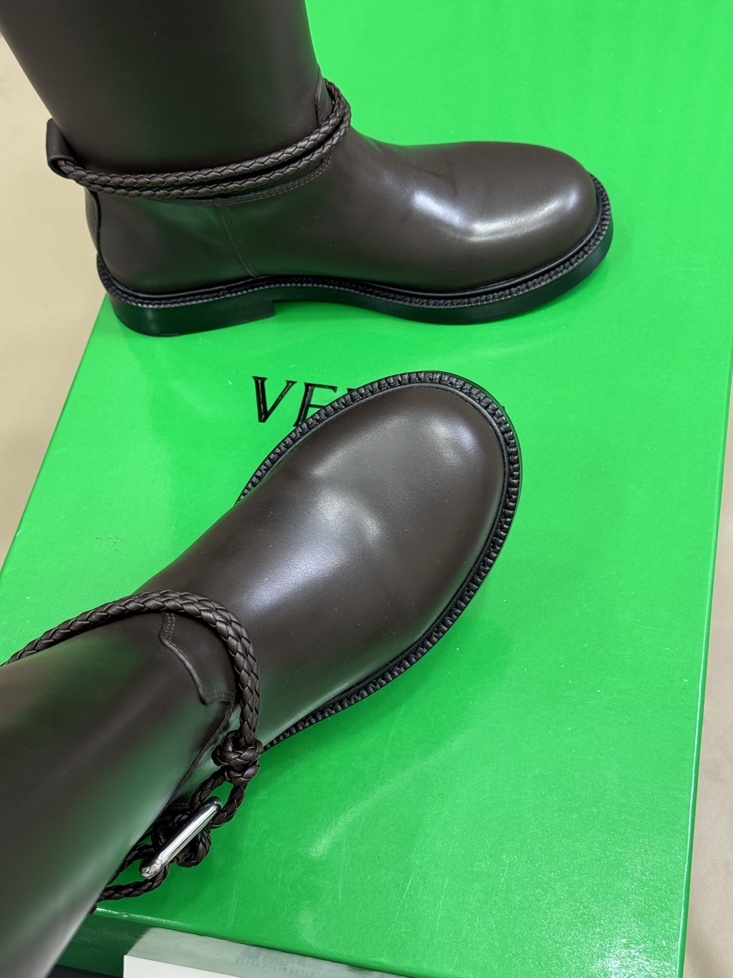 These Bottega Veneta boots also feature a sturdy, low heel that provides just enough lift without sacrificing comfort. The rounded toe adds to the classic aesthetic, making them a timeless addition to your footwear collection. The minimalist design ensures that these boots can be paired with a wide range of outfits, from tailored trousers to flowing dresses.