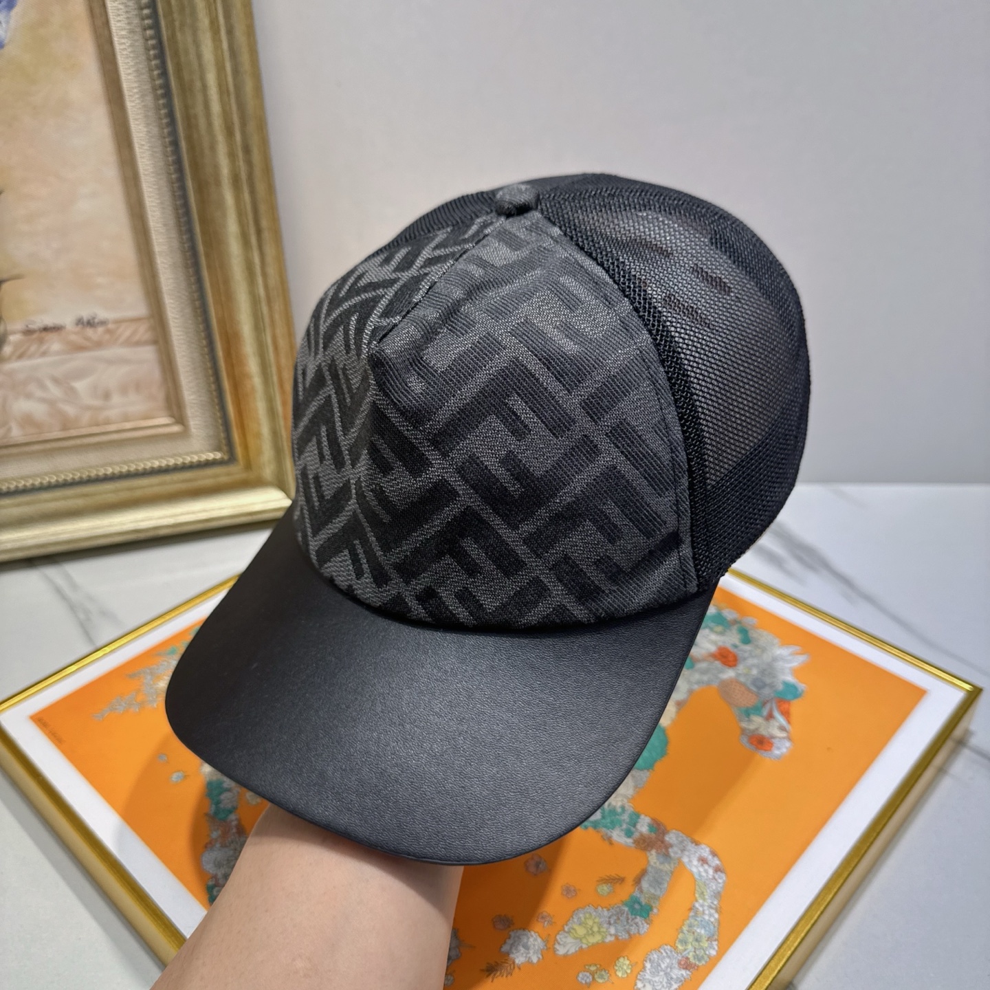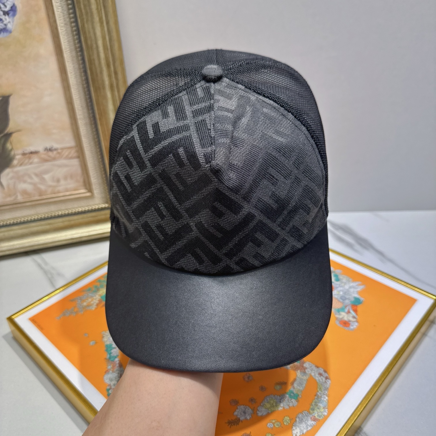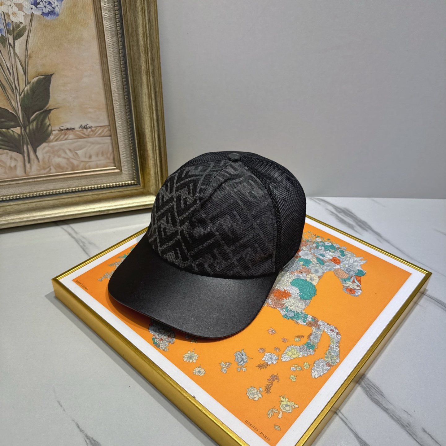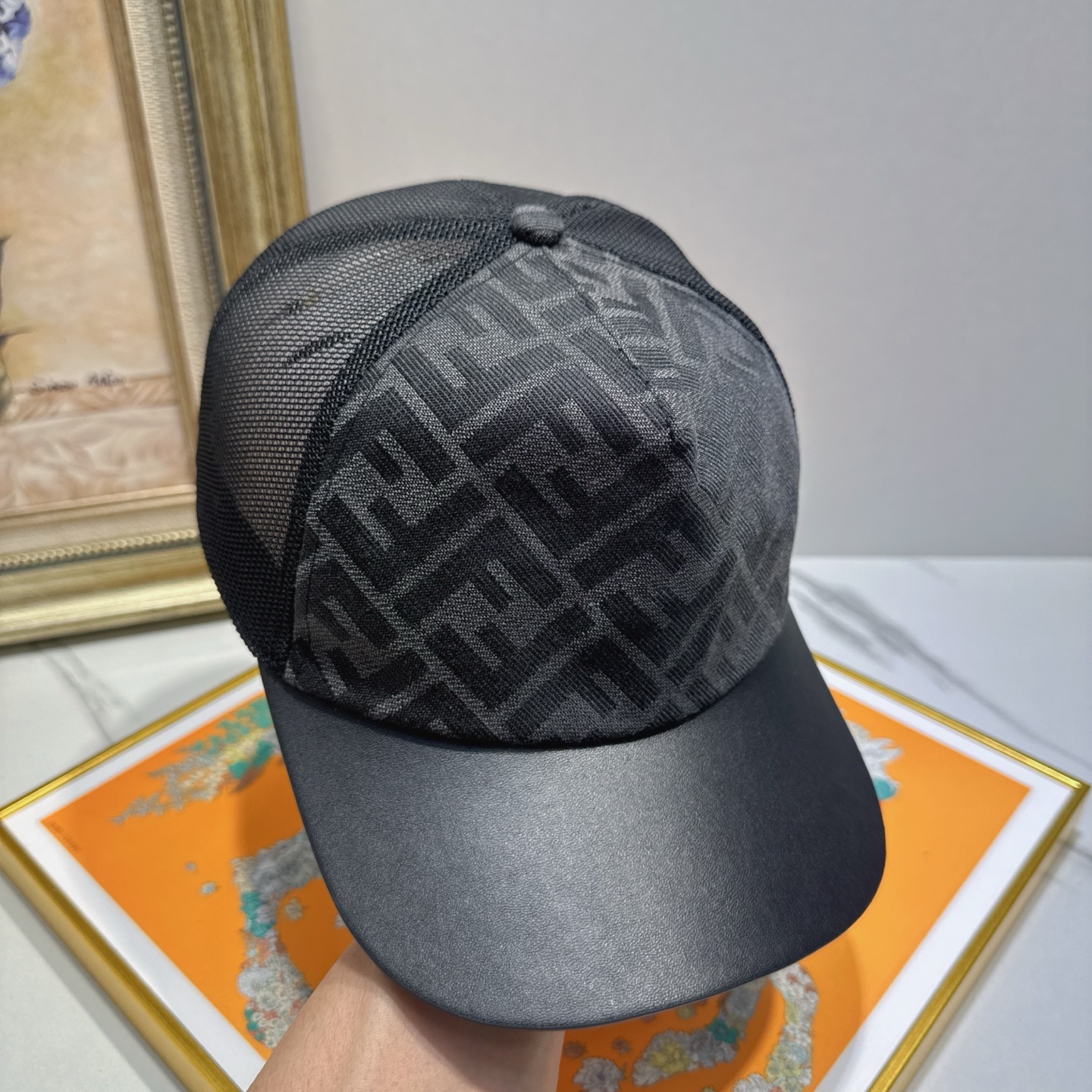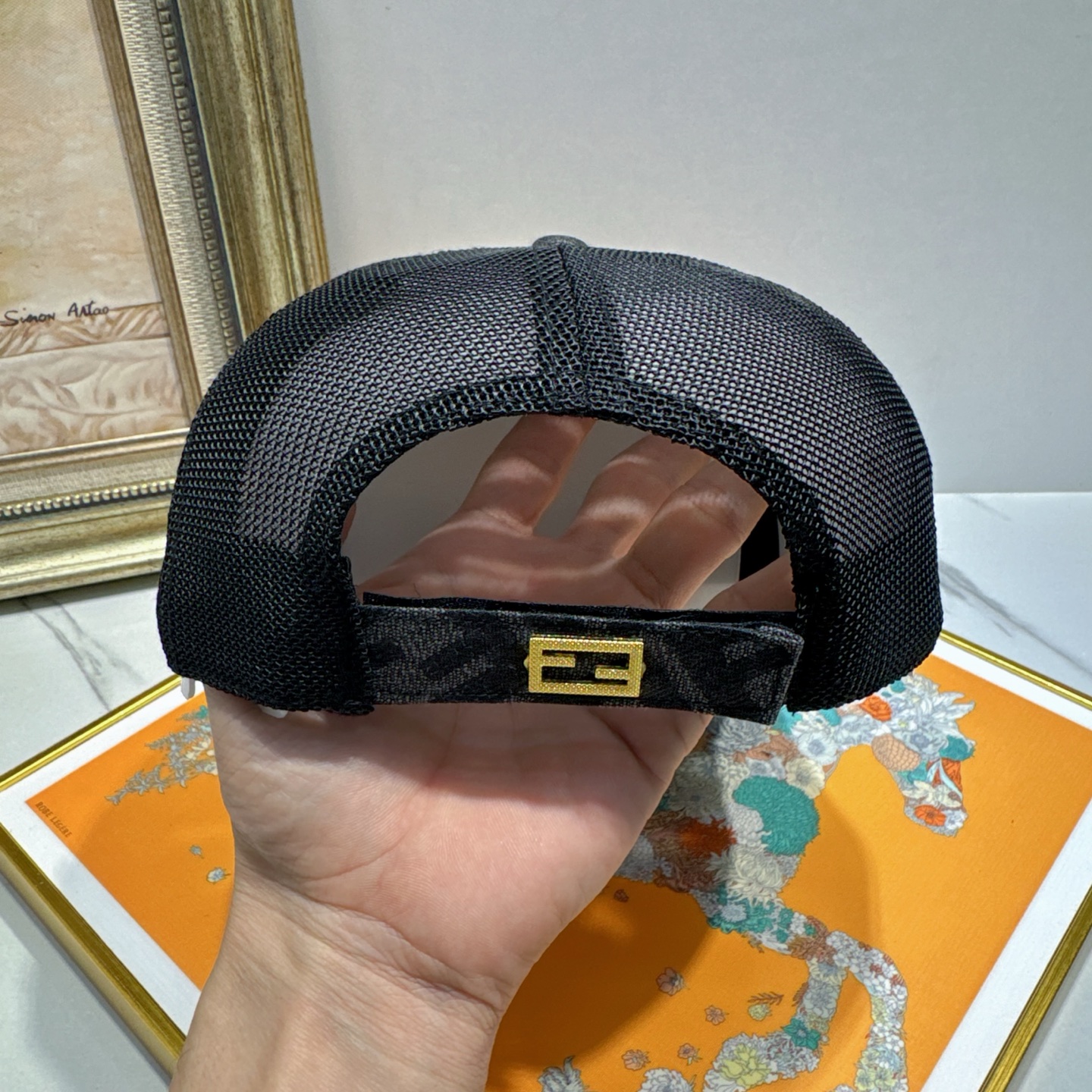 Fendi Black FF Print Cap - Elevate your streetwear game with the Fendi Black FF Print Mesh Cap, a stylish and breathable accessory that seamlessly blends luxury with urban cool. This cap is a testament to Fendi's iconic design aesthetic, featuring the brand's signature FF logo in a sophisticated black-on-black print. Perfect for adding a touch of high-fashion flair to any casual outfit, the Fendi Black FF Print Mesh Cap is a must-have for fashion enthusiasts who appreciate quality craftsmanship and distinctive style. The cap is designed for both comfort and durability, making it an ideal choice for everyday wear or special occasions. The intricate mesh design ensures breathability, keeping you cool and comfortable, while the premium materials guarantee longevity. This Fendi cap is more than just an accessory; it's a statement piece that showcases your impeccable taste. The Fendi Black FF Print Mesh Cap is meticulously crafted to meet the highest standards of quality. The cap features a classic baseball cap silhouette, with a structured brim that provides ample shade and protection from the sun. The adjustable strap at the back ensures a snug and comfortable fit for all head sizes, while the subtle Fendi branding adds a touch of understated elegance. The cap is versatile enough to be paired with a wide range of outfits, from casual jeans and a t-shirt to more polished ensembles.