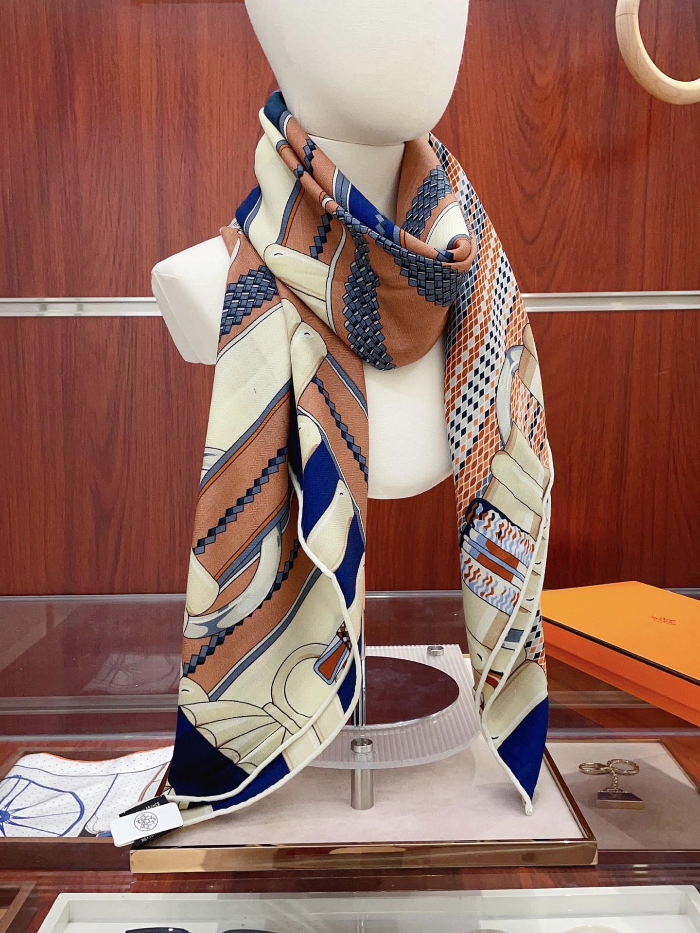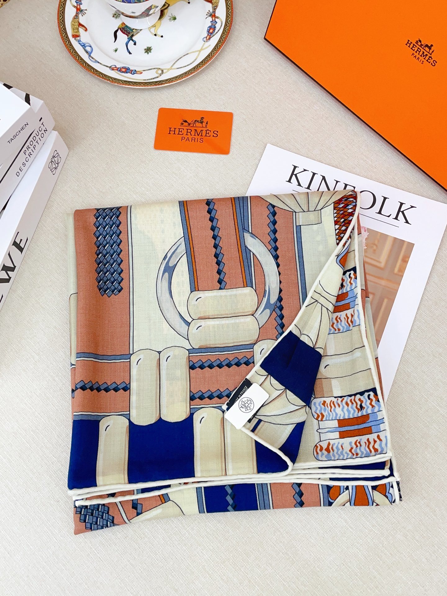 The scarf features a detailed equestrian-inspired design, showcasing elegant horses, riding gear, and other related motifs. These intricate patterns are carefully crafted to create a visually stunning and sophisticated look. The equestrian theme adds a touch of classic charm and timeless elegance to the scarf, making it a perfect accessory for those who appreciate traditional design elements.