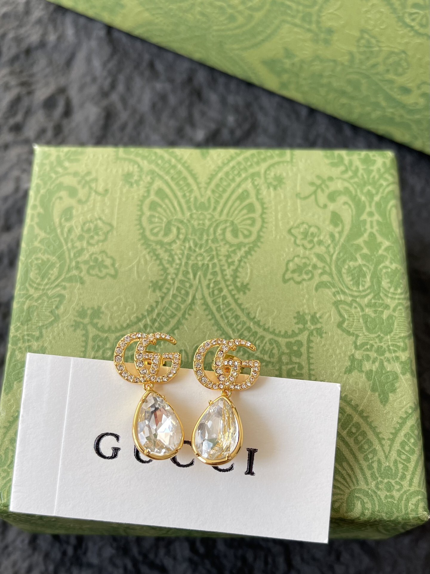 gg elegant Gucci Gold Crystal Teardrop Earrings - Discover the epitome of luxury with the Gucci Gold Crystal GG Teardrop Earrings. These exquisite earrings seamlessly blend iconic Gucci design with timeless elegance, making them the perfect accessory for any discerning fashion enthusiast. Featuring the signature GG logo adorned with sparkling crystals and a delicate teardrop pendant, these earrings are a statement of sophistication and style. The Gucci Gold Crystal GG Teardrop Earrings are meticulously crafted with premium materials, ensuring both durability and lasting beauty. Whether you're attending a special event or simply elevating your everyday look, these earrings will add a touch of glamour and refinement to any ensemble. These earrings are a must-have addition to your jewelry collection, reflecting your impeccable taste and appreciation for high-end fashion.