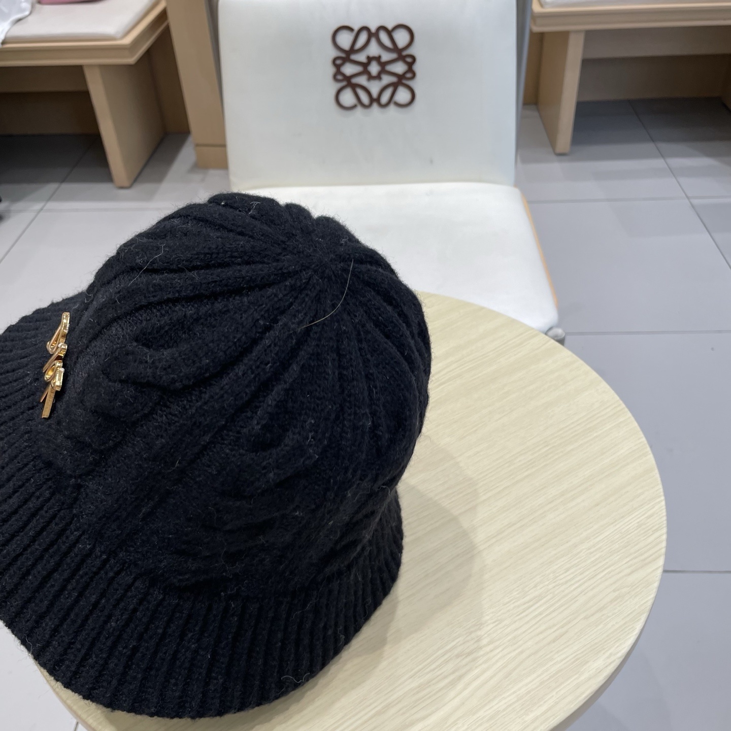gold detail Loewe Black Knit Bucket Hat - Elevate your style with the sophisticated Loewe Black Knit Bucket Hat. This luxury accessory combines comfort, warmth, and high fashion, making it the perfect addition to any wardrobe. Crafted from premium knit materials and featuring elegant gold detailing, this hat is designed to turn heads and add a touch of class to any ensemble. The Loewe Black Knit Bucket Hat is not just an accessory; it's a statement of refined taste. When you are looking for headwear that combines comfort, style and luxury, the Loewe Black Knit Bucket Hat is an excellent choice.