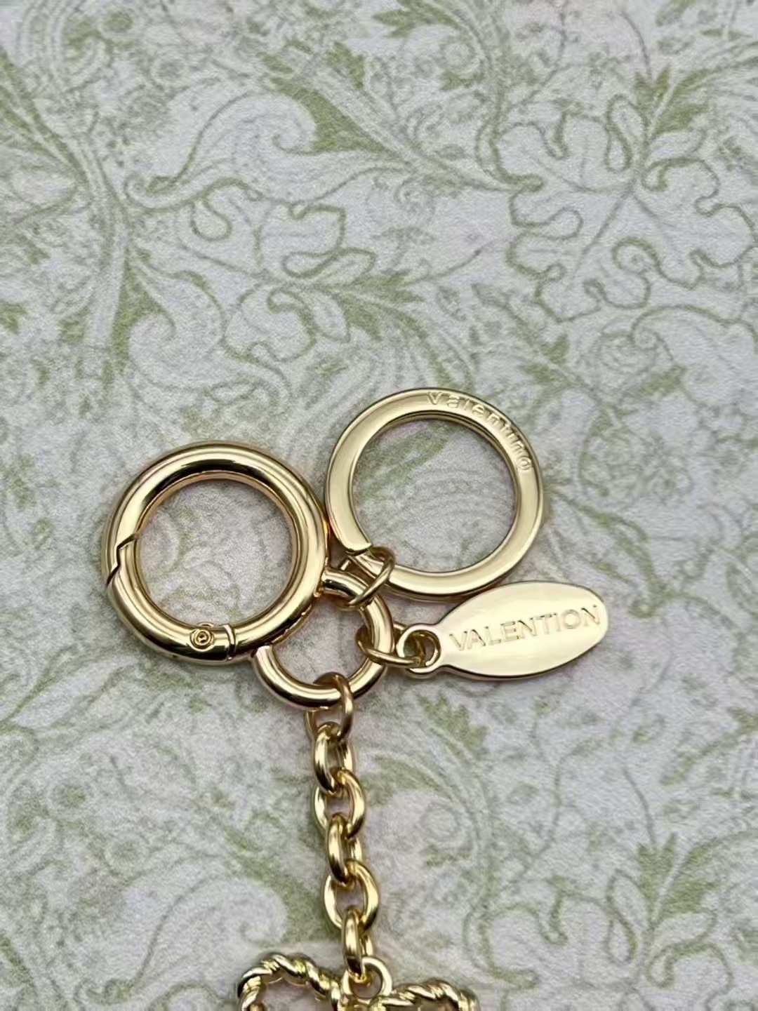 The Valentino Red Cherry Keychain stands out with its meticulous attention to detail and high-quality materials. The vibrant red cherry charms are crafted from a durable, glossy material that captures light beautifully, creating a striking visual effect. Each cherry is embellished with the Valentino logo in a luxurious gold tone, adding a touch of sophistication and brand recognition. The charms are suspended from a delicate yet sturdy gold-tone chain, ensuring that the keychain can withstand daily wear and tear. The keychain also features a secure clasp, allowing you to easily attach it to your keys, handbag, or backpack.