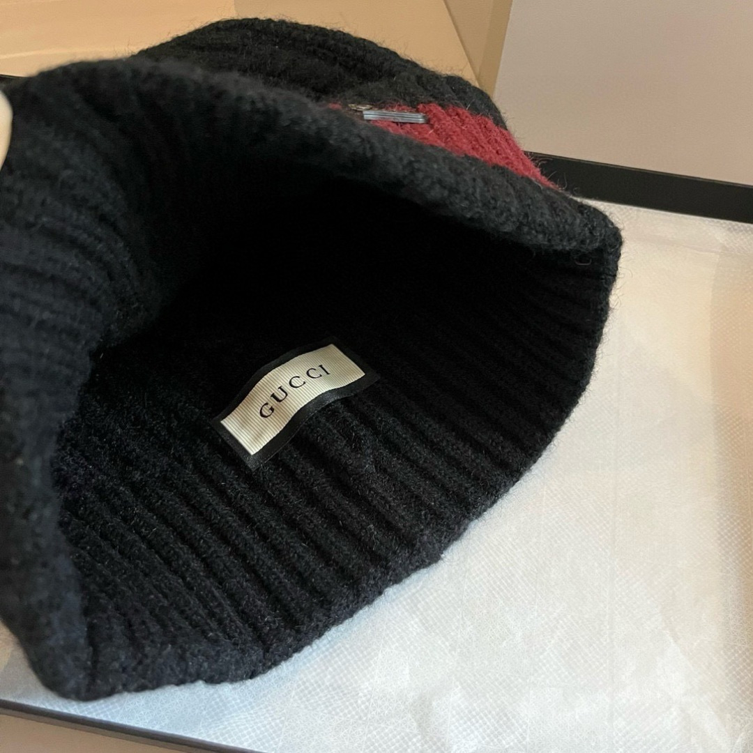 - Unveiling the Exquisite Details of the Gucci Black Wool Beanie Hat with Red Stripe