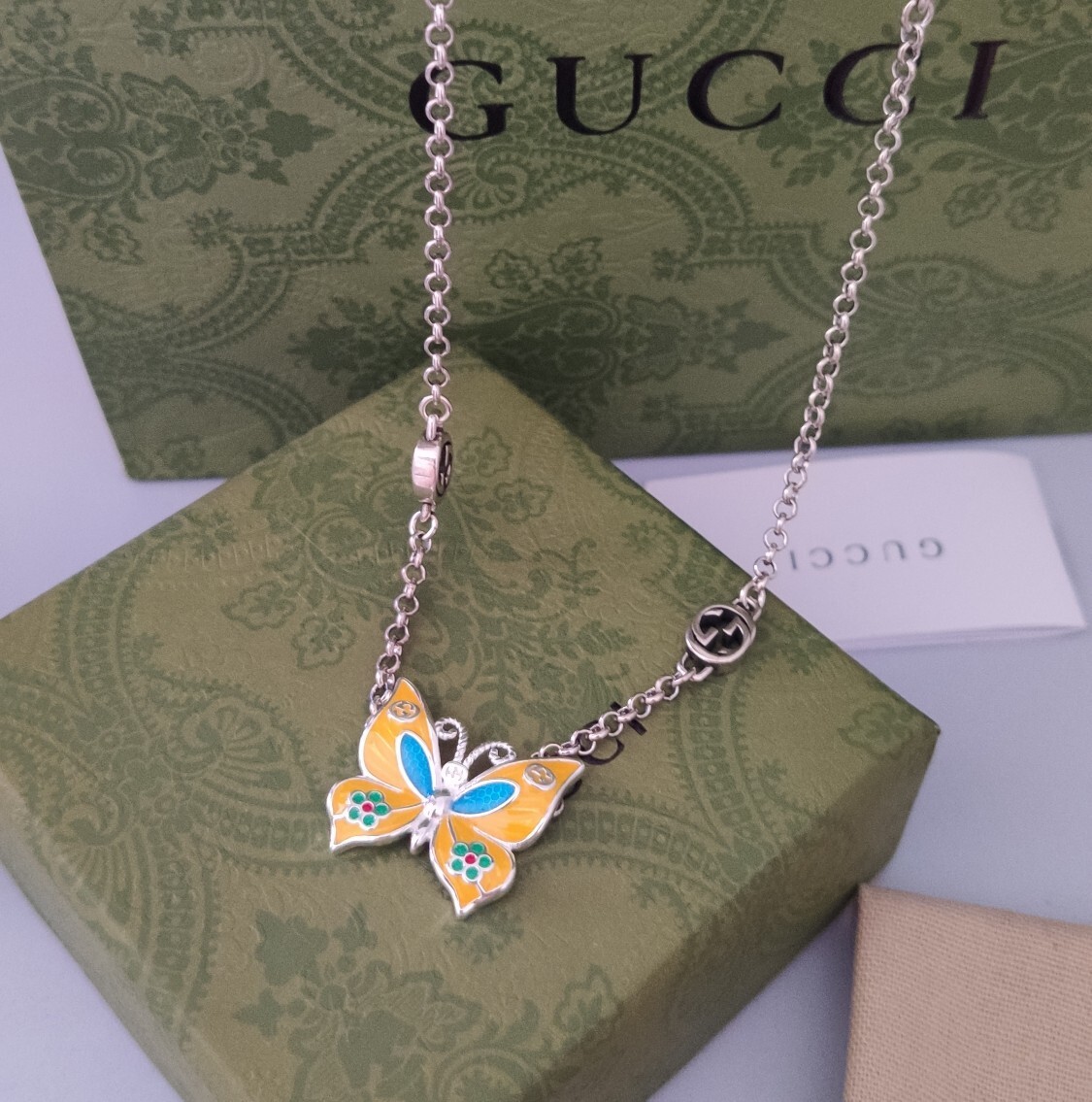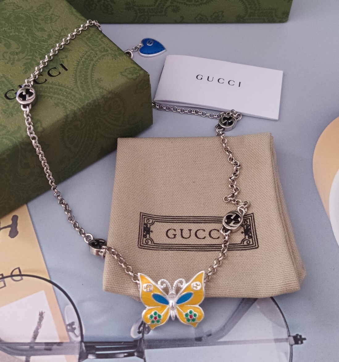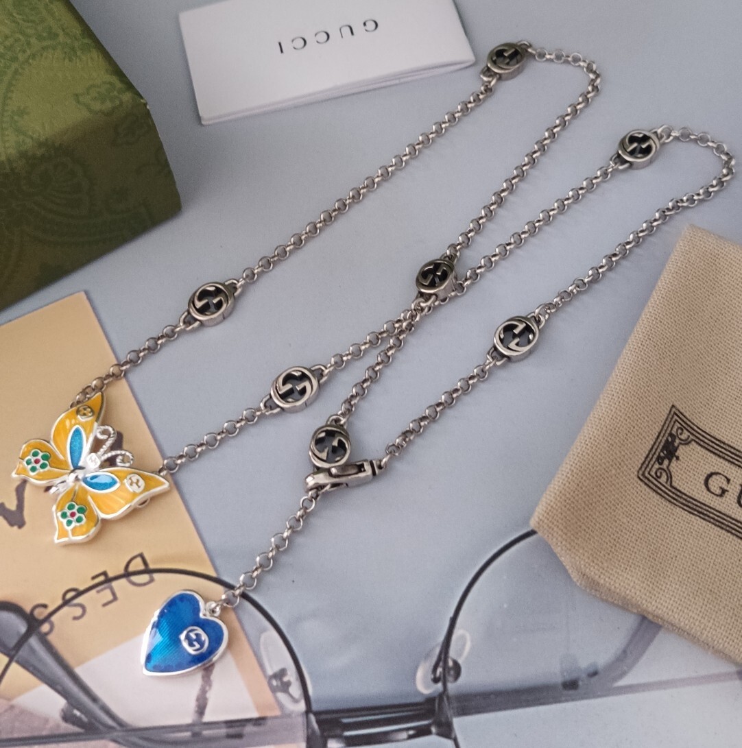 This bracelet features a delicate chain adorned with iconic Gucci logo motifs, leading to a captivating butterfly charm. The butterfly is intricately enameled in vibrant hues, creating a captivating focal point. A charming blue heart adds an extra touch of elegance.