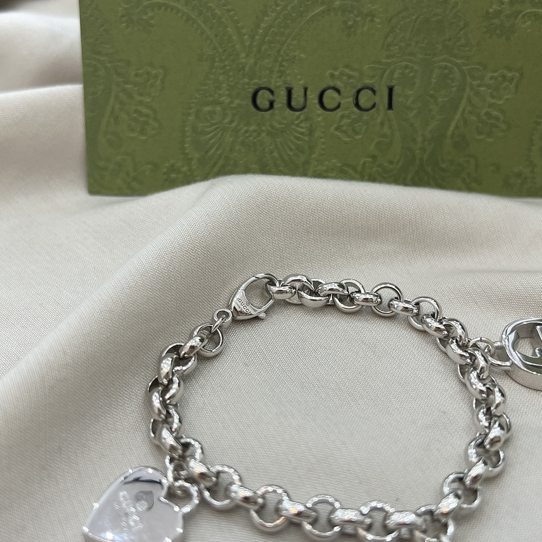 The Gucci Charm Bracelet boasts a durable and lustrous silver finish, ensuring longevity and enduring shine. The iconic Gucci charms, including the signature interlocking G logo, a delicate heart, and a sparkling star, add a touch of whimsy and sophistication. Each charm is carefully crafted and securely attached to the chain, ensuring a comfortable and secure fit.