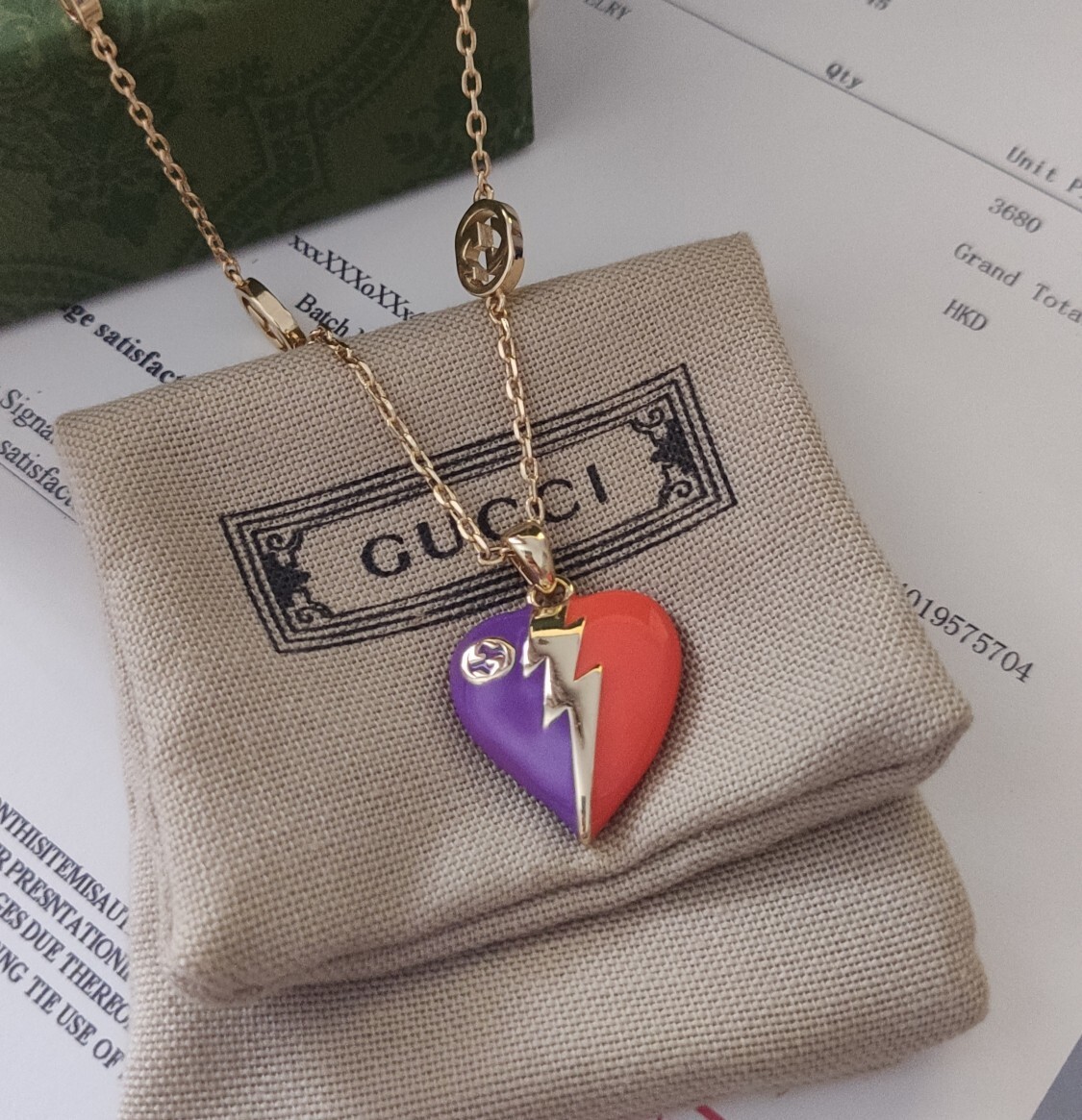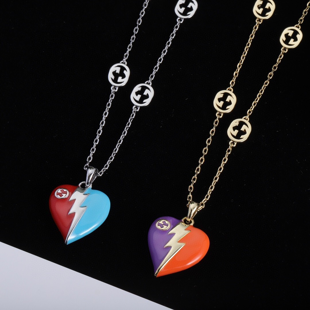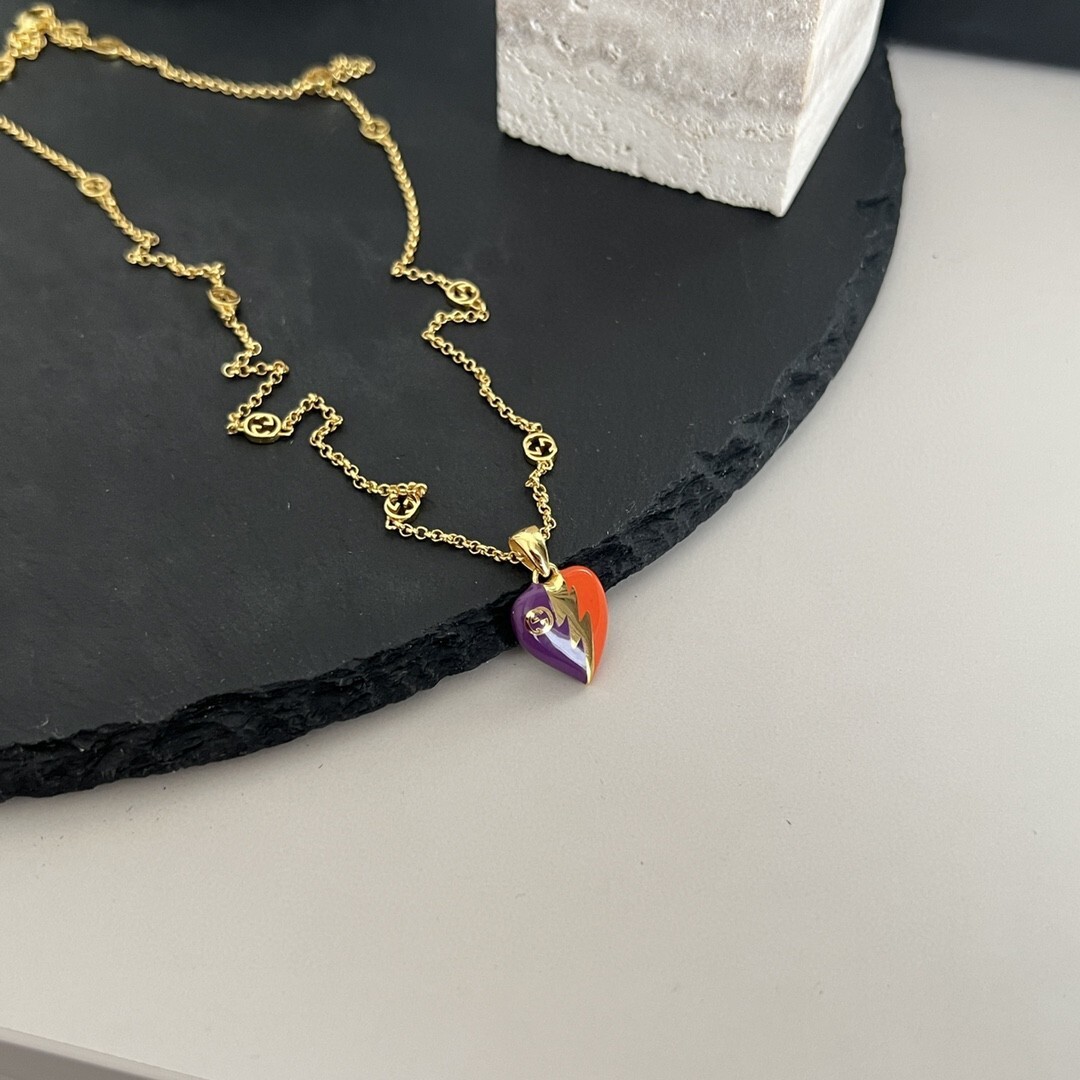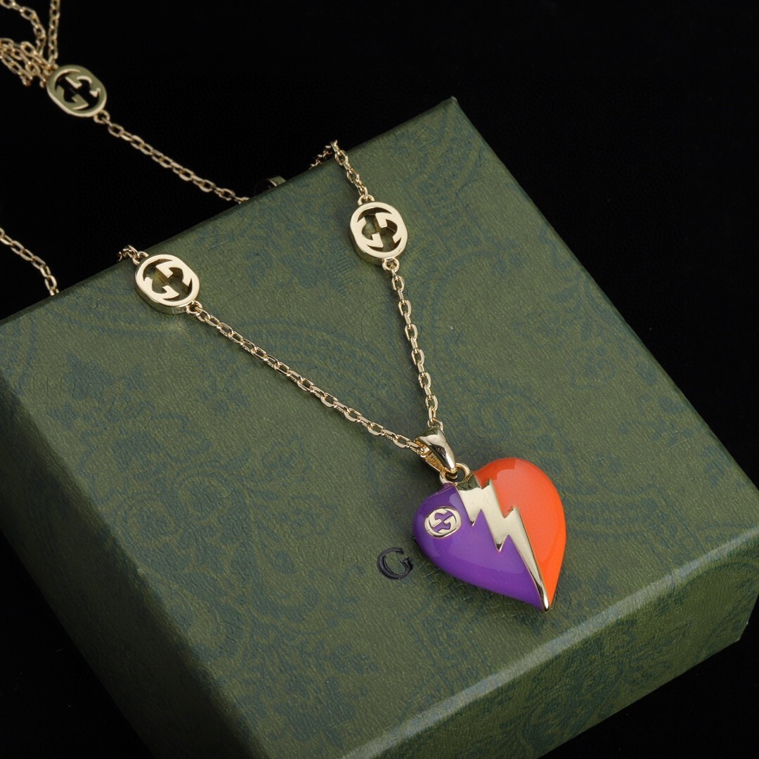 The Gucci Enamel Heart Necklace is more than just a piece of jewelry; it's a symbol of style, individuality, and luxury. This necklace allows you to express your unique personality and make a bold fashion statement. The distinctive design, featuring a heart-shaped pendant and a lightning bolt motif, sets it apart from other necklaces. The high-quality materials and meticulous craftsmanship ensure that it will remain a cherished piece of your jewelry collection for years to come. Whether you're looking to treat yourself or find the perfect gift for someone special, the Gucci Enamel Heart Necklace is an excellent choice. It's a versatile accessory that can be worn with a variety of outfits, from casual to formal, adding a touch of elegance and sophistication to any look. With proper care, this necklace will continue to shine and sparkle, making you feel confident and stylish every time you wear it.