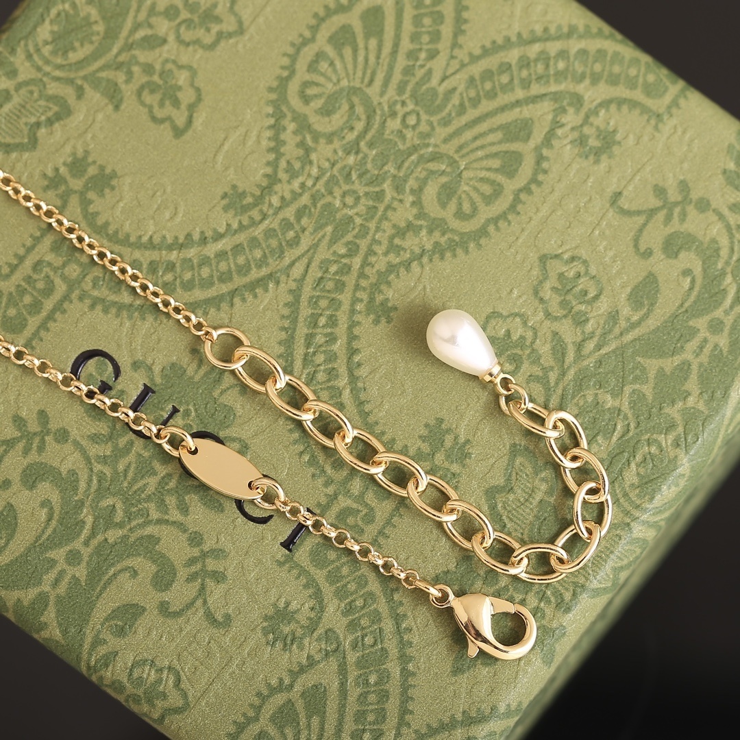 The necklace features a delicate chain with evenly spaced pearls, creating a balanced and harmonious look. The focal point is the interlocking G pendant, which is not only a symbol of the Gucci brand but also a stylish design element in its own right. The pearl drop suspended from the pendant adds a touch of sophistication and movement, making the necklace even more eye-catching. The adjustable clasp ensures a comfortable and secure fit.