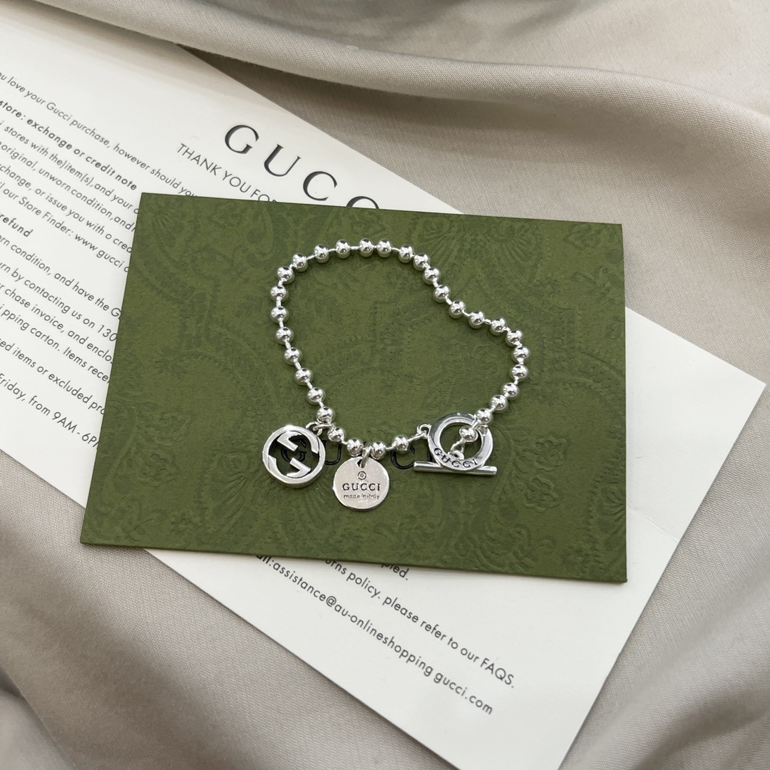 Crafted from high-quality sterling silver, this bracelet features the iconic Gucci Interlocking G charm, a symbol of the brand's heritage and enduring style. The delicate chain, composed of intricately linked silver beads, adds a touch of sophistication and grace. The secure T-bar closure ensures a comfortable and secure fit.
