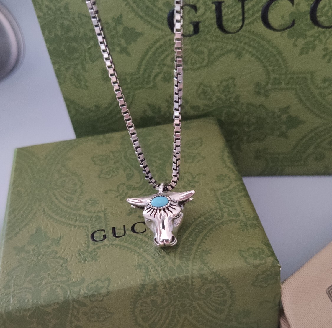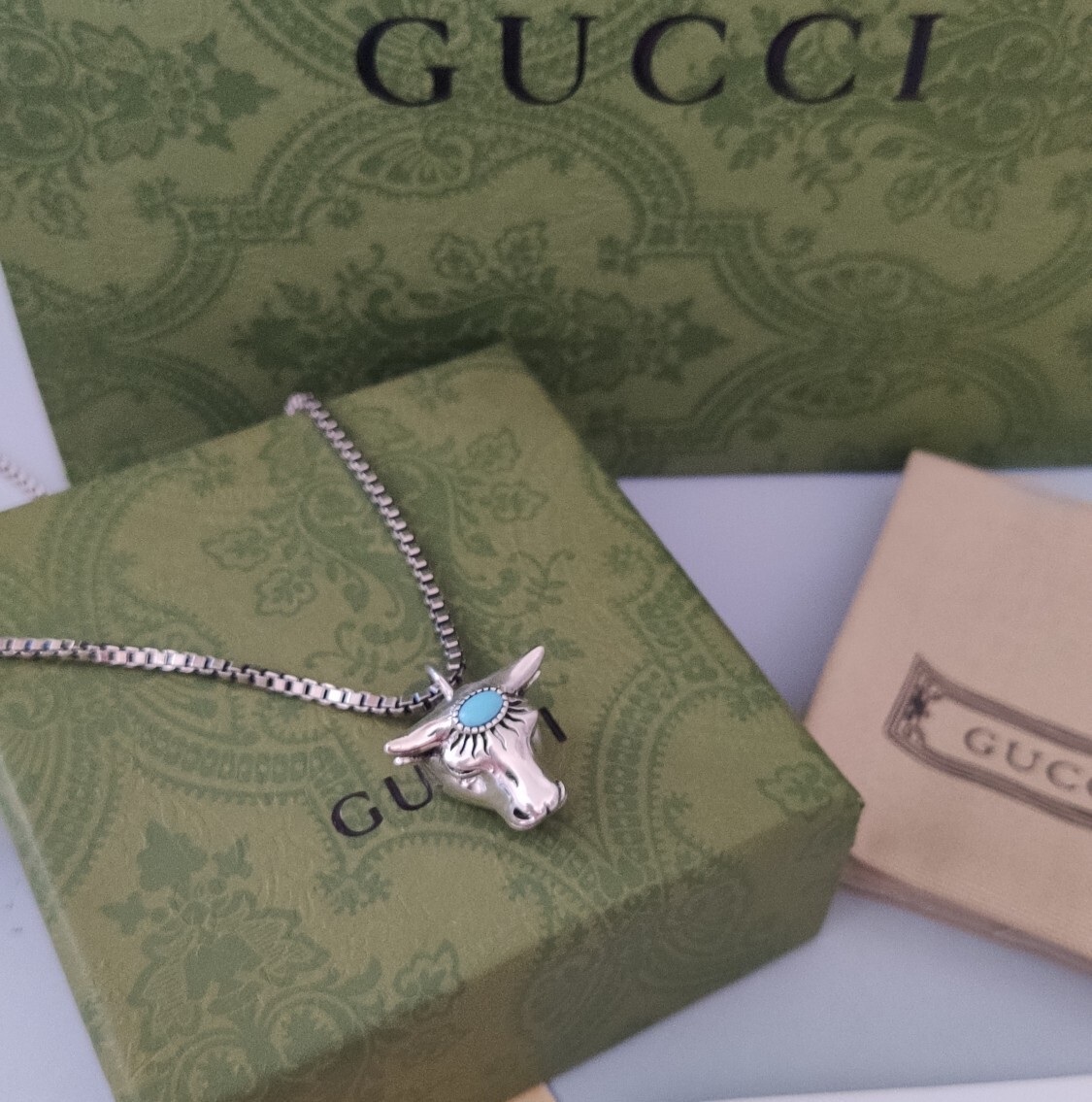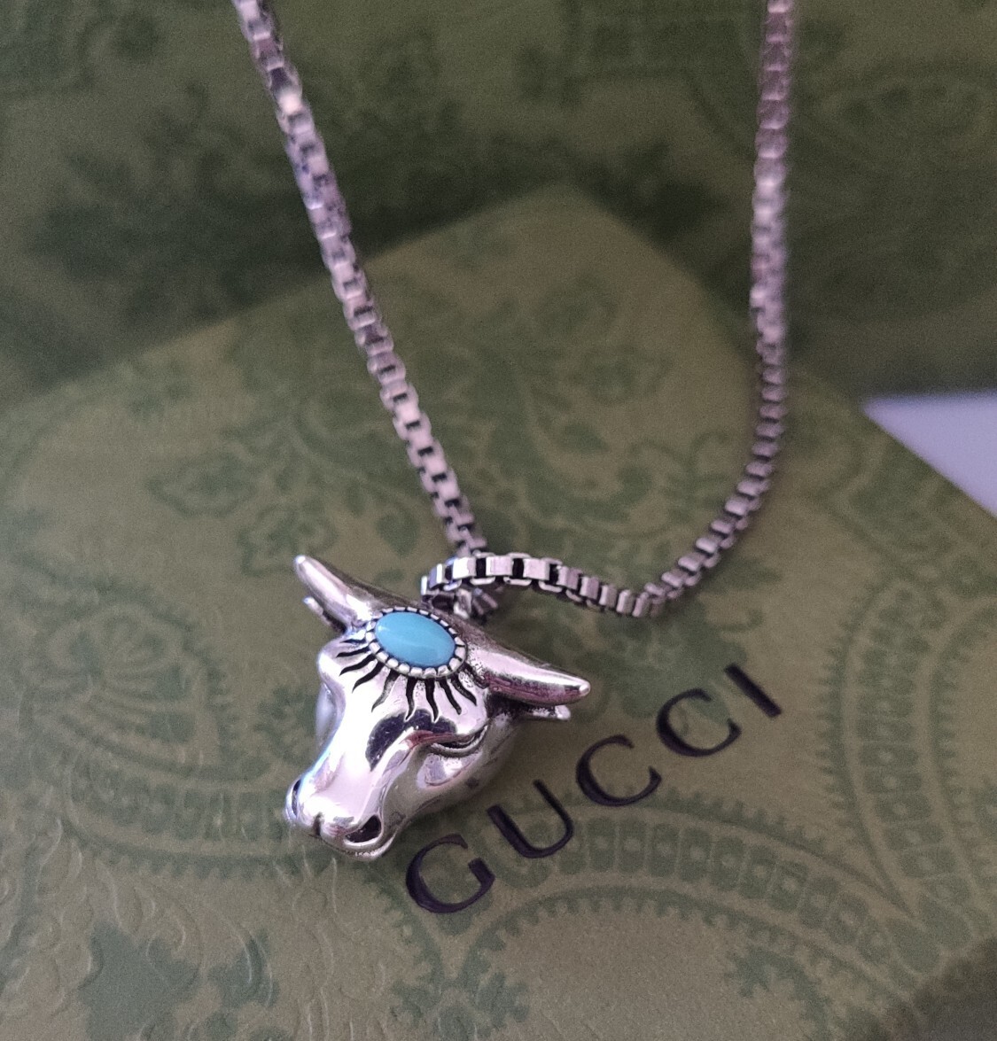 The Gucci Silver Bull Head Necklace is a striking piece of jewelry that combines bold design with refined craftsmanship. This necklace features a distinctive bull head pendant crafted from high-quality sterling silver, accentuated with a vibrant turquoise stone. The unique design and luxurious materials make it a standout accessory for any fashion enthusiast.