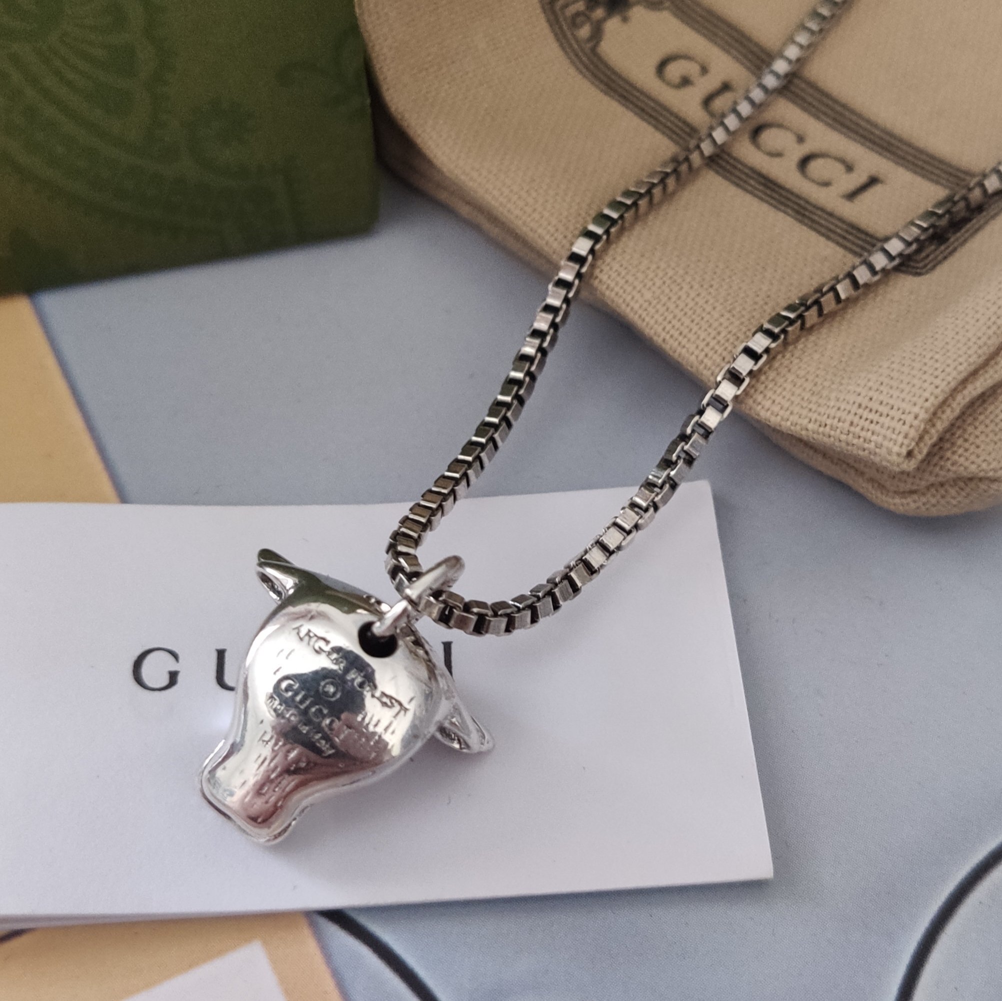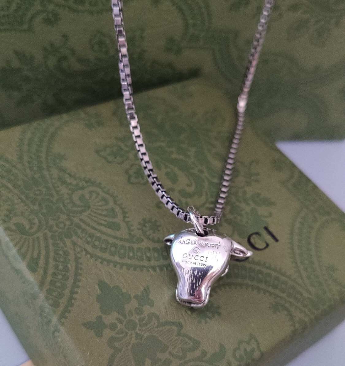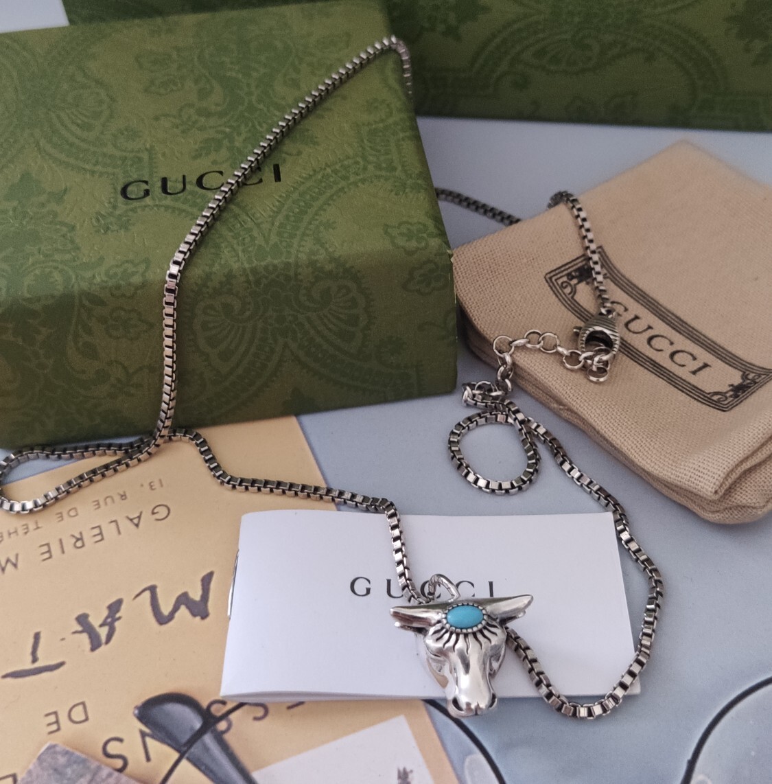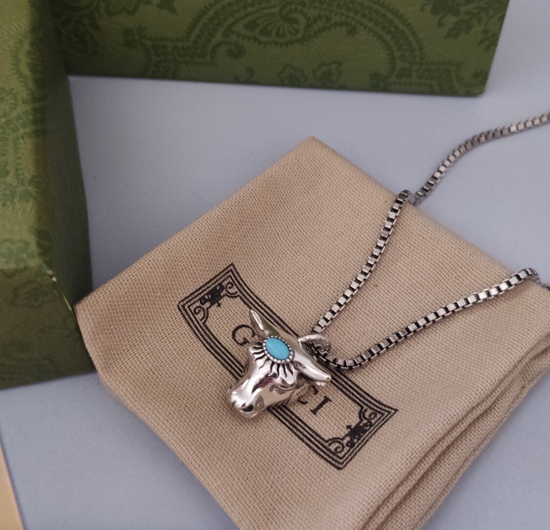 The Gucci Silver Bull Head Necklace is a striking piece of jewelry that combines bold design with refined craftsmanship. This necklace features a distinctive bull head pendant crafted from high-quality sterling silver, accentuated with a vibrant turquoise stone. The unique design and luxurious materials make it a standout accessory for any fashion enthusiast.
