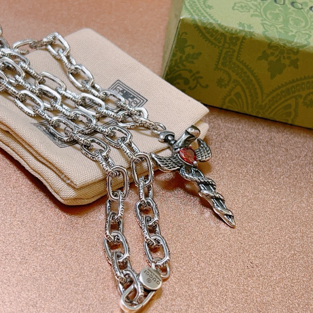 Gucci is renowned for its commitment to quality and craftsmanship. The Gucci Silver Caduceus Pendant Necklace is meticulously crafted from premium sterling silver and adorned with a stunning red crystal. Each piece undergoes rigorous quality control checks to ensure it meets the brand's exacting standards.