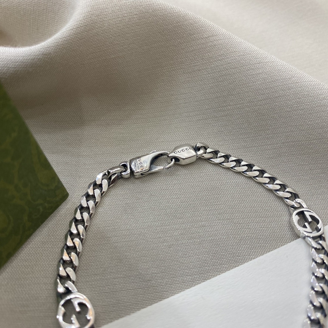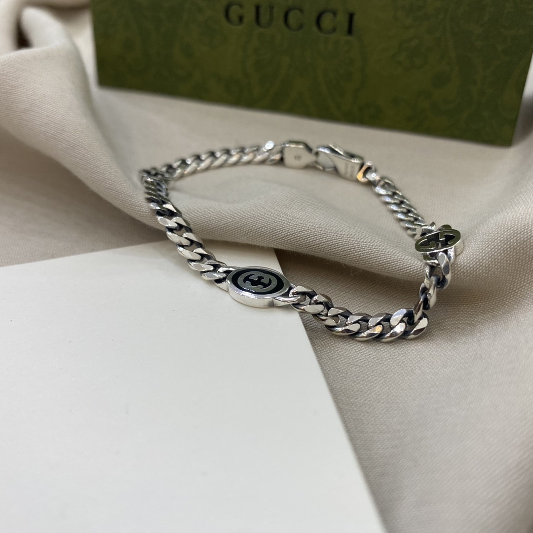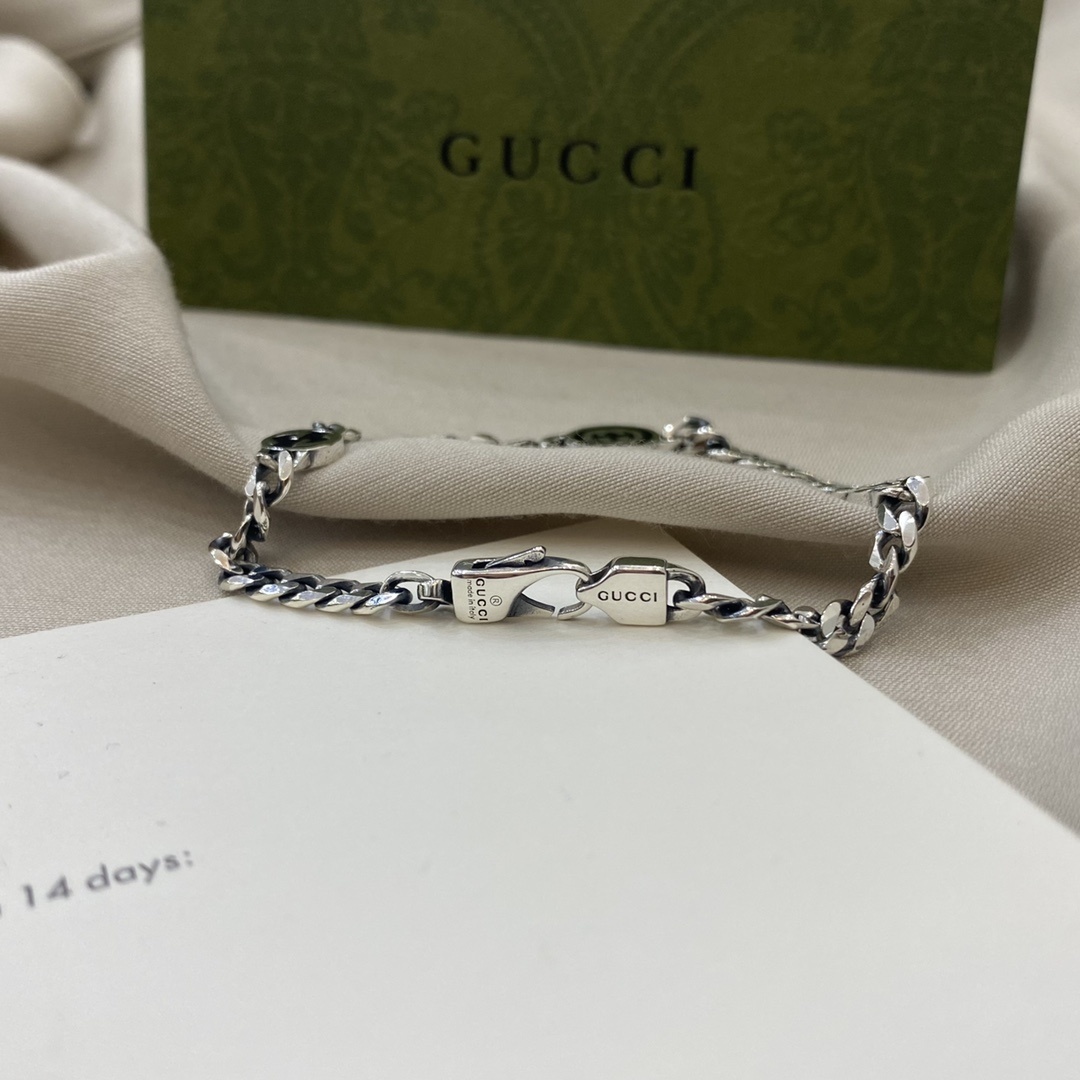 This bracelet features a robust sterling silver chain adorned with signature Gucci motifs. The interlocking GG logo is subtly incorporated into the design, adding a touch of brand recognition without being overtly ostentatious. The secure clasp ensures a comfortable and confident fit, allowing you to wear this piece with ease and peace of mind.