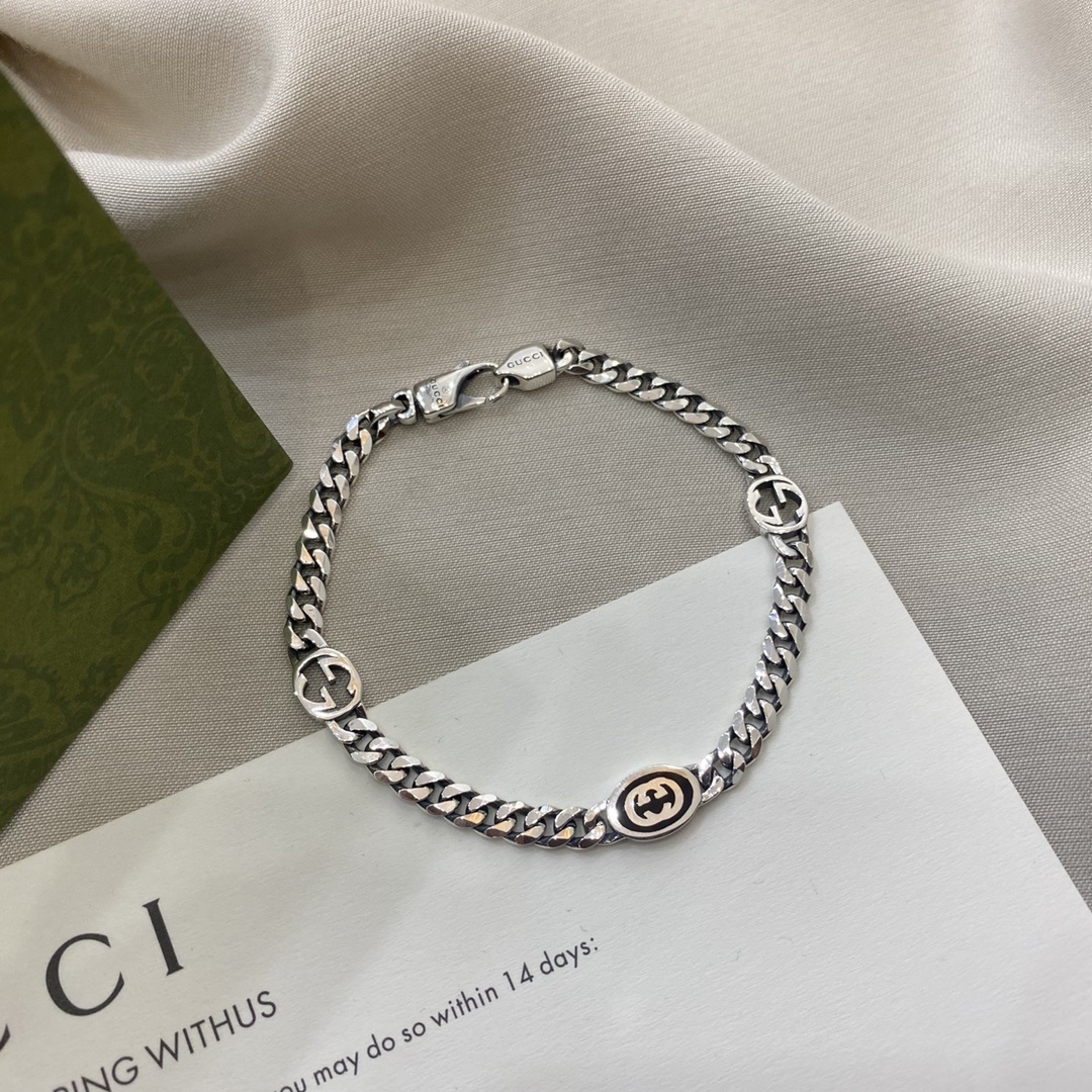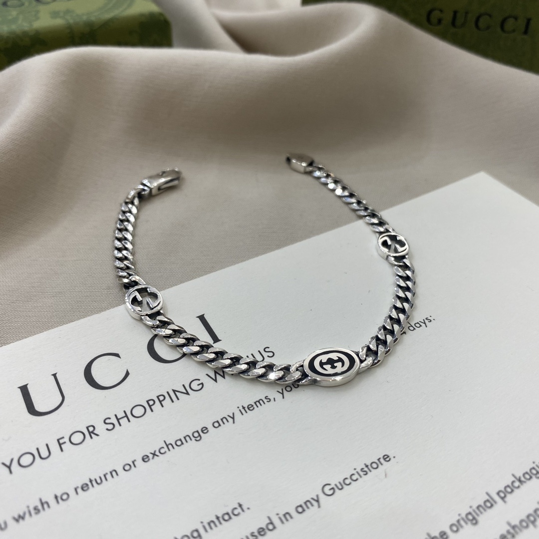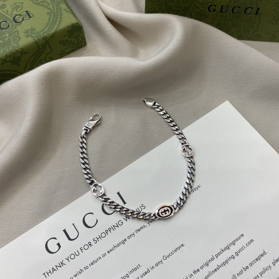This bracelet features a robust sterling silver chain adorned with signature Gucci motifs. The interlocking GG logo is subtly incorporated into the design, adding a touch of brand recognition without being overtly ostentatious. The secure clasp ensures a comfortable and confident fit, allowing you to wear this piece with ease and peace of mind.