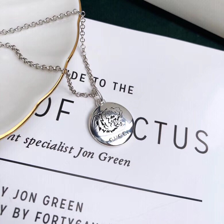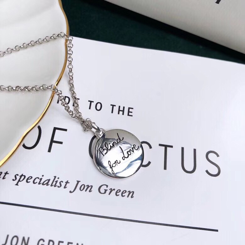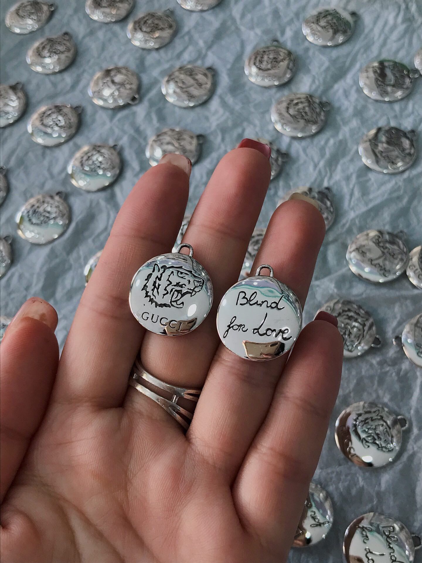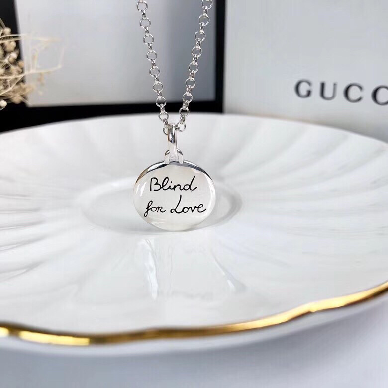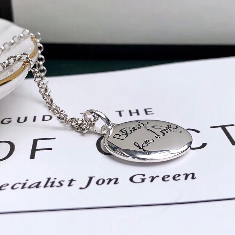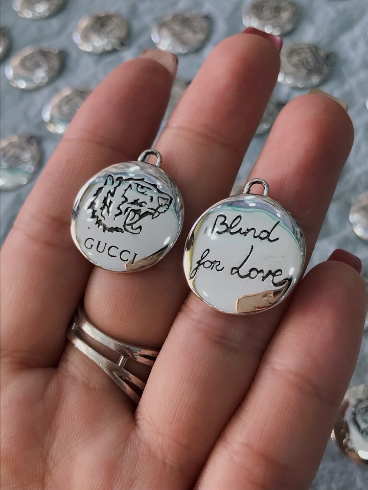 The Gucci Silver Charm Set features two distinct designs, each with its own unique charm and appeal. The first pendant showcases the iconic Tiger motif, a symbol of strength, courage, and untamed beauty. The tiger is rendered in exquisite detail, with intricate lines and shading that bring the majestic creature to life. The second pendant features the inscription 'Blind for Love,' a romantic and whimsical phrase that captures the essence of passion and devotion. The inscription is elegantly rendered in a stylish font, adding a touch of sophistication and playfulness to the design. Both pendants are crafted from high-quality silver, ensuring durability and a lasting shine. The silver provides a lustrous backdrop for the intricate designs, enhancing their visual impact and creating a sense of timeless elegance.