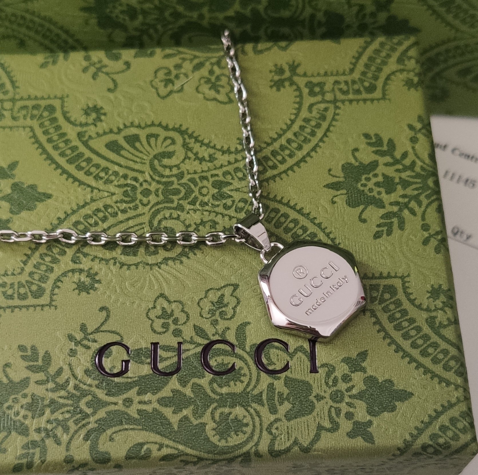 Elevate your style with the exquisite Gucci Silver Hexagon Logo Necklace, a symbol of Italian craftsmanship and timeless elegance. This stunning piece features a unique hexagon-shaped pendant adorned with the iconic Gucci logo and the inscription "Made in Italy," showcasing the brand's commitment to quality and heritage. Crafted from high-quality silver, this necklace is designed to add a touch of sophistication to any outfit, making it perfect for both casual and formal occasions. Whether you're looking to treat yourself or find the perfect gift for a loved one, the Gucci Silver Hexagon Logo Necklace is a must-have addition to any jewelry collection. Its sleek design and luxurious feel make it a standout piece that will be cherished for years to come.