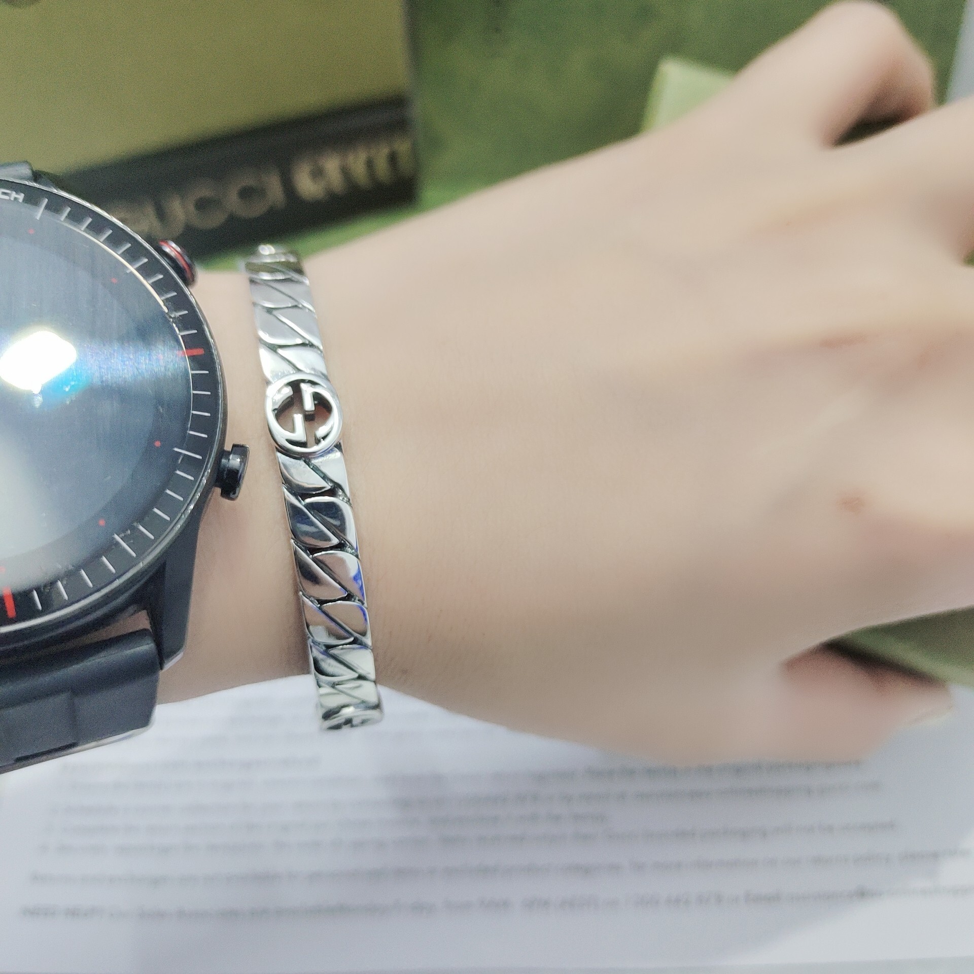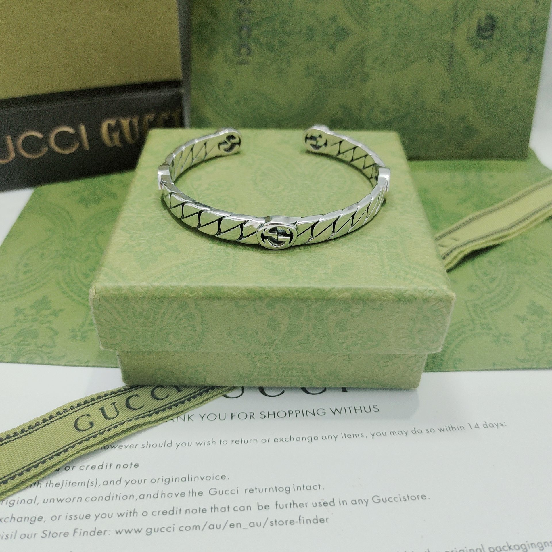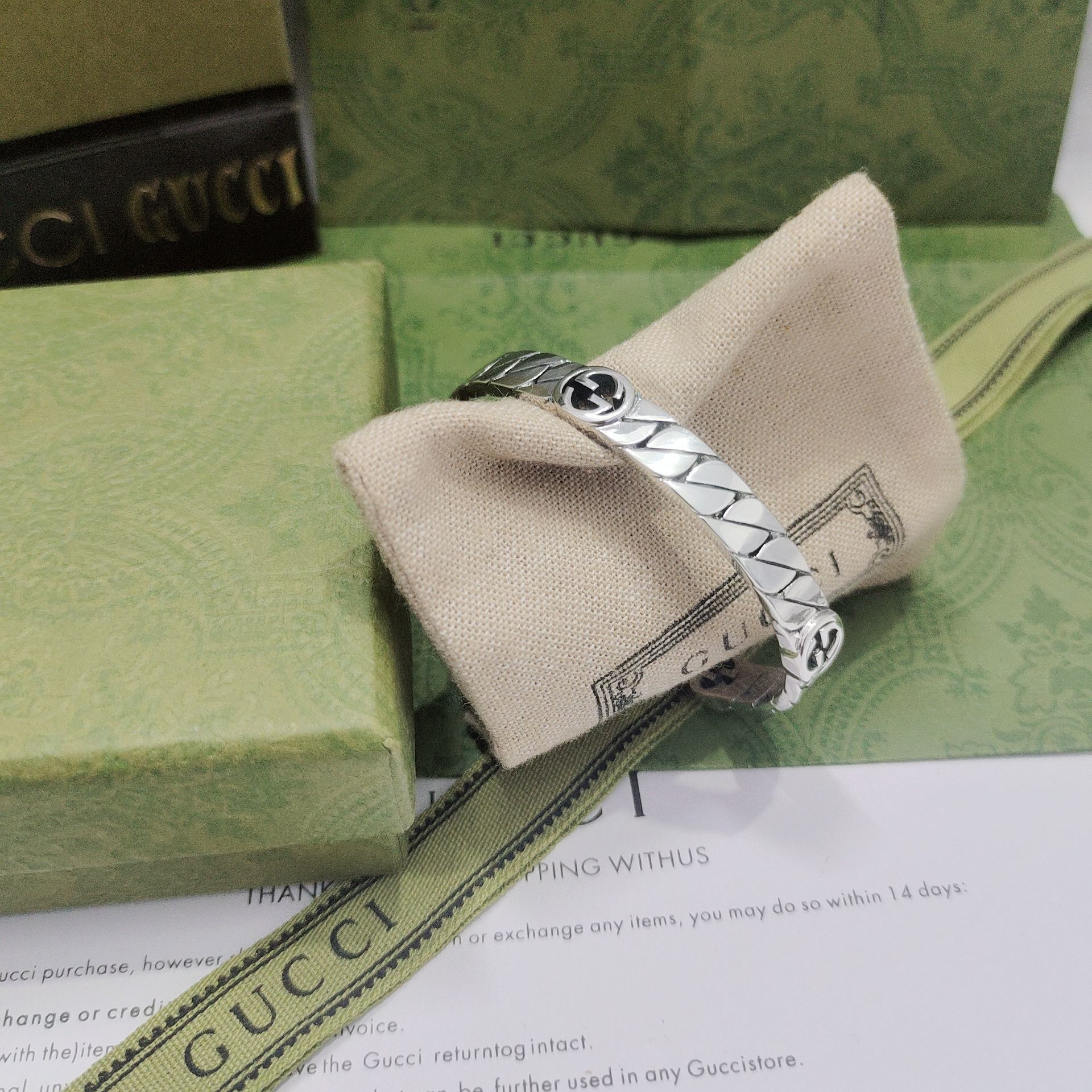 To maintain the beauty and shine of your Gucci Silver Interlocking G Open Cuff Bracelet, proper care is essential. Sterling silver can tarnish over time, but with the right care, you can keep your bracelet looking its best. Here are some tips to help you protect your investment: