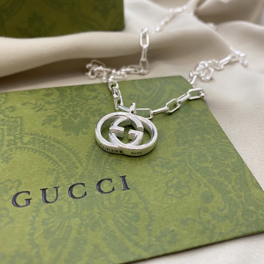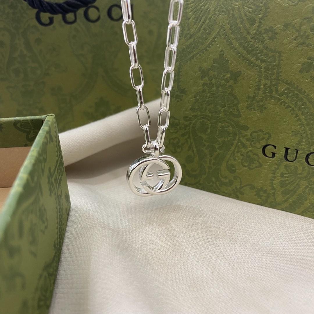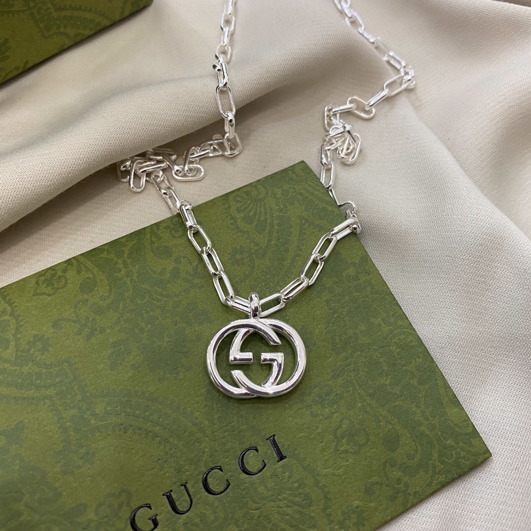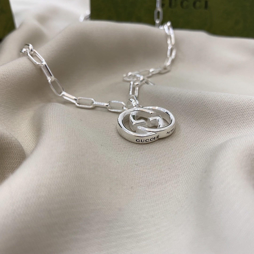 This necklace is crafted from high-quality sterling silver, ensuring durability and a lasting shine. The intricate detailing of the interlocking GG logo showcases Gucci's commitment to superior craftsmanship. The silver material is hypoallergenic, making it suitable for those with sensitive skin.