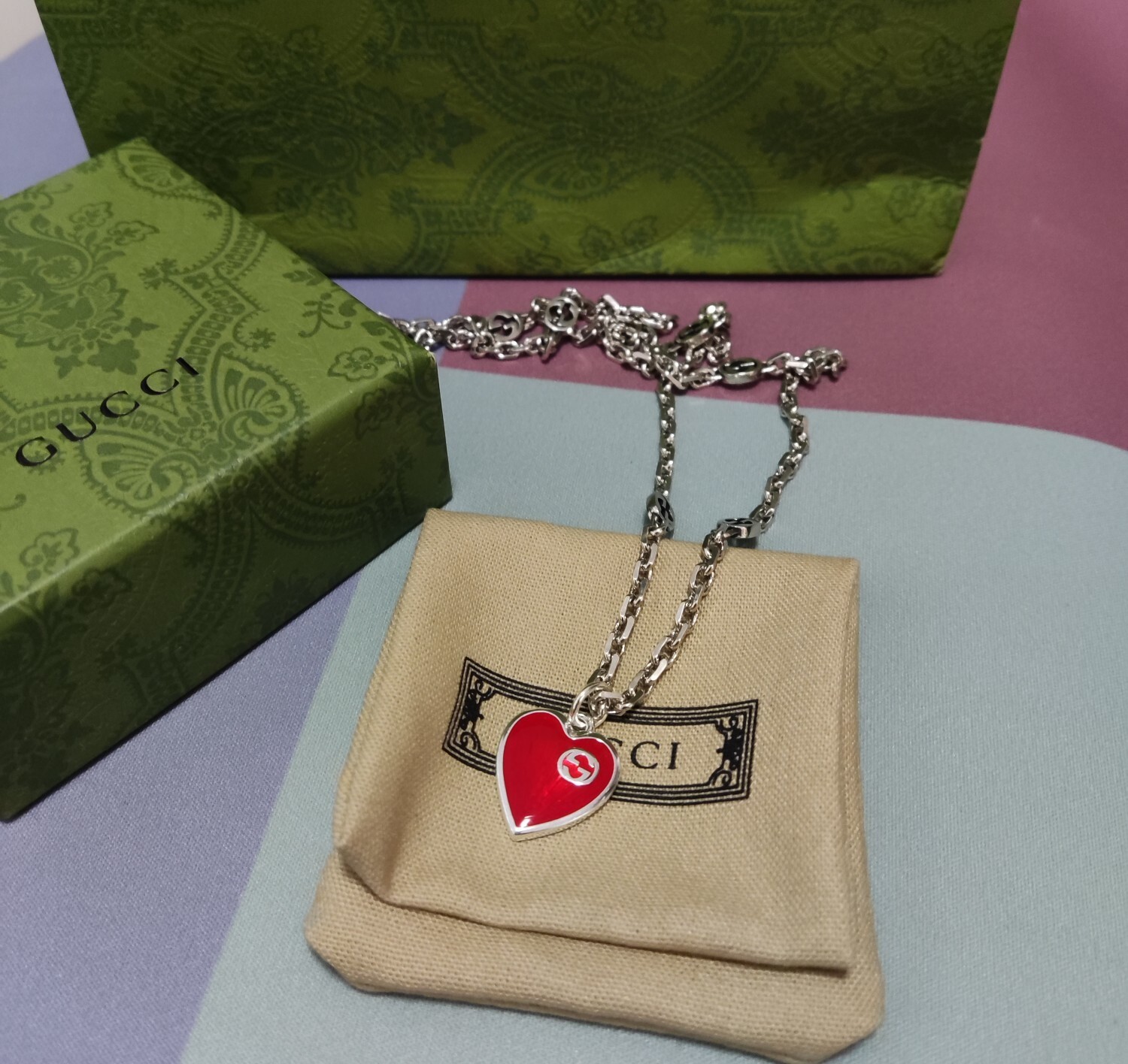 - Iconic Design: The necklace showcases the iconic Gucci logo and a striking red heart pendant, making it a recognizable and fashionable accessory.
