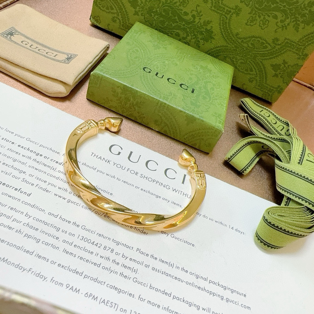 This bangle is meticulously crafted from premium gold, ensuring durability and a lasting shine. The twisted design is not only visually appealing but also adds a unique texture to the piece. The open cuff style allows for easy wear and a comfortable fit for various wrist sizes. The minimalist yet elegant design makes it versatile, suitable for both casual and formal occasions. The Gucci branding adds a touch of prestige, making it a coveted item for fashion enthusiasts.