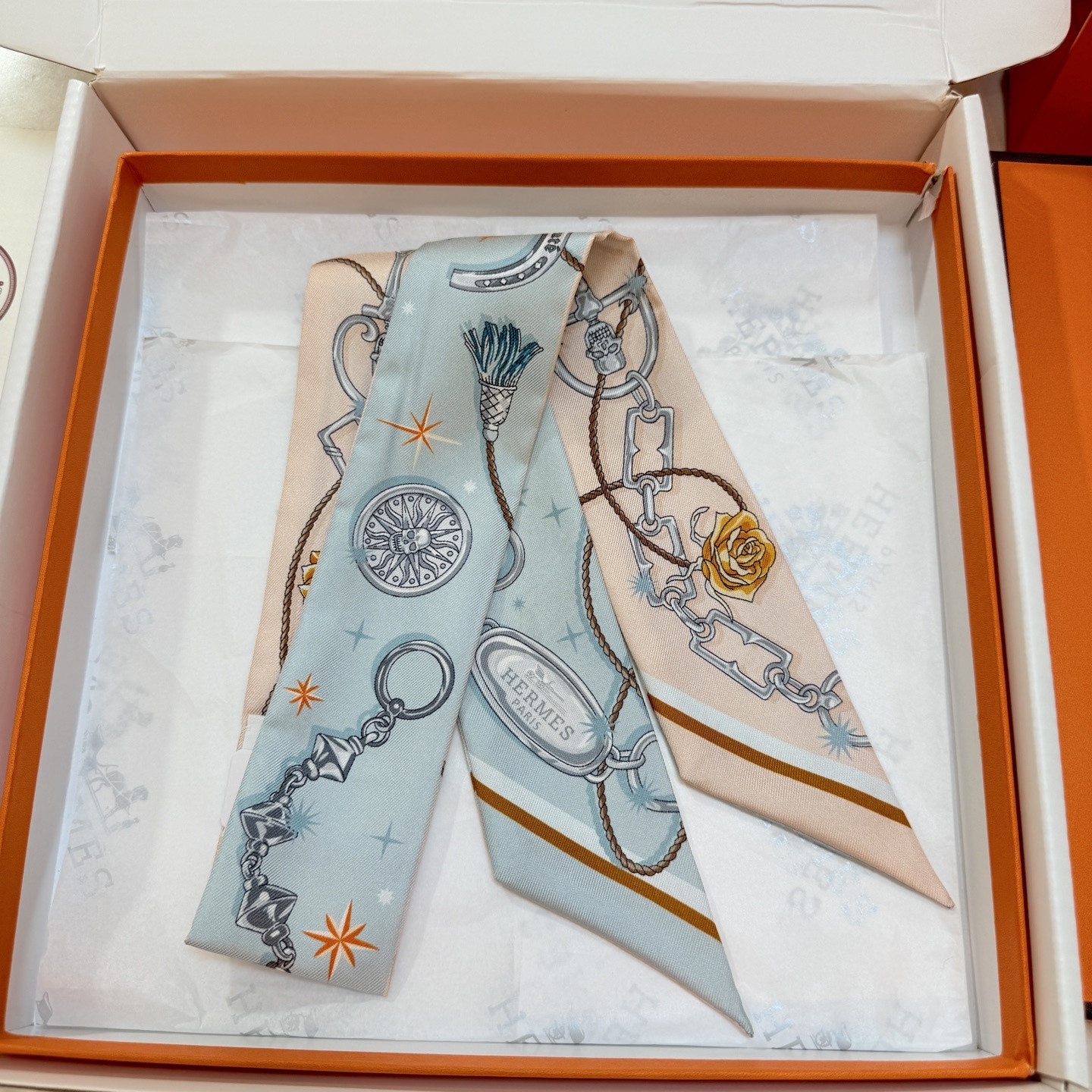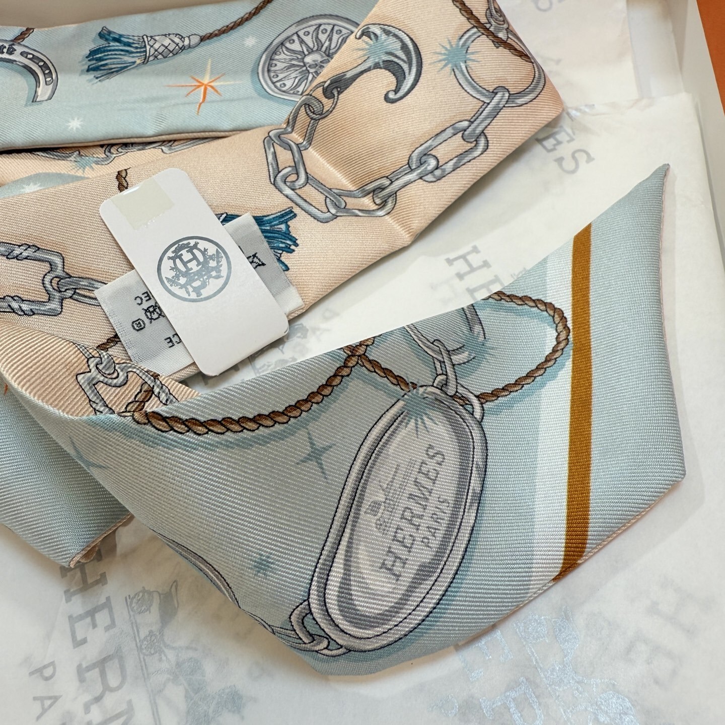 Here are some frequently asked questions about the Hermès Twilly Silk Scarf - Blue & Pink Chain Print: