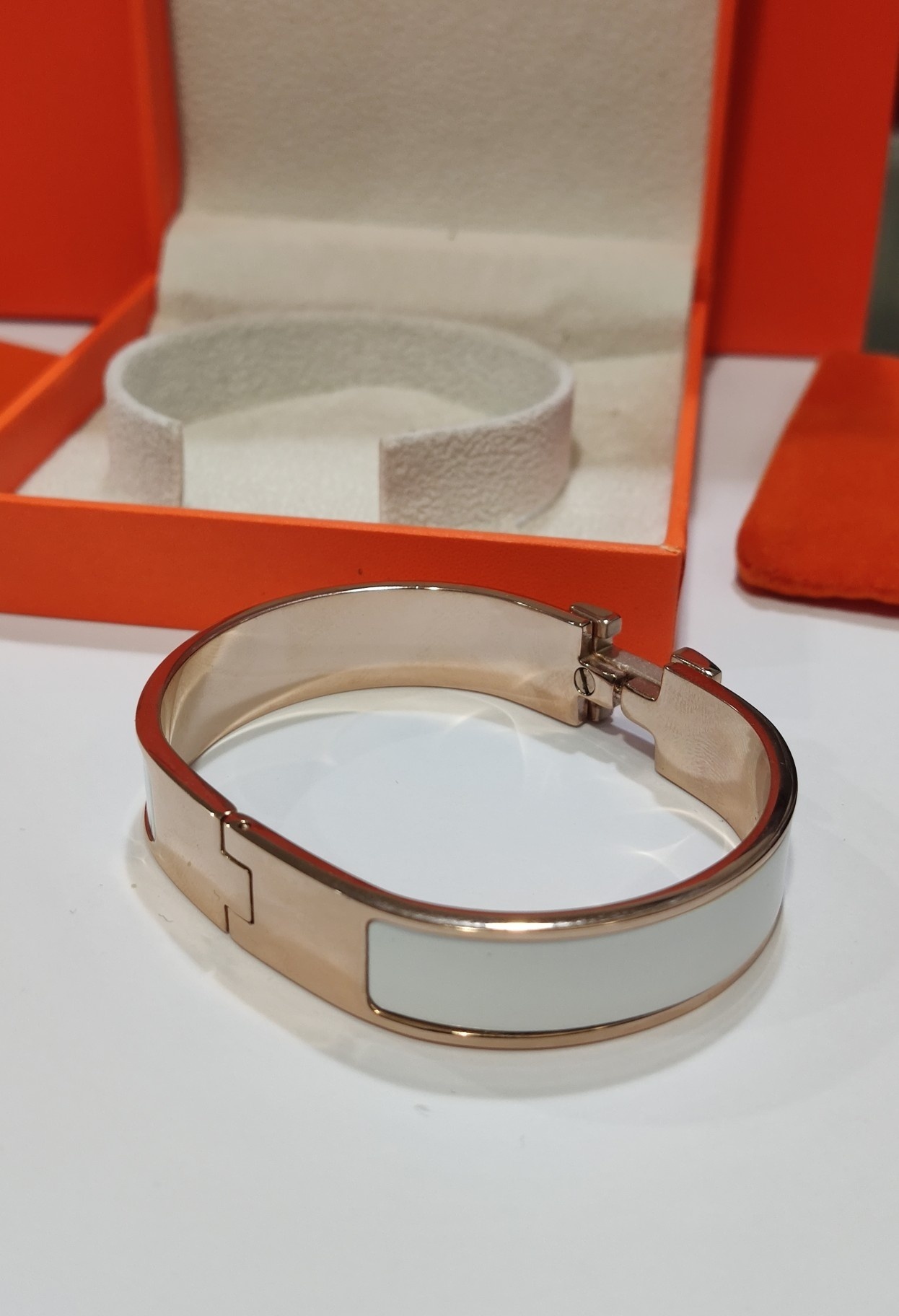 To maintain the pristine condition of your Hermes Clic H bracelet, avoid exposure to harsh chemicals, perfumes, and excessive moisture. Gently clean with a soft cloth to remove any dirt or residue. Store in a protective pouch or jewelry box when not in use.