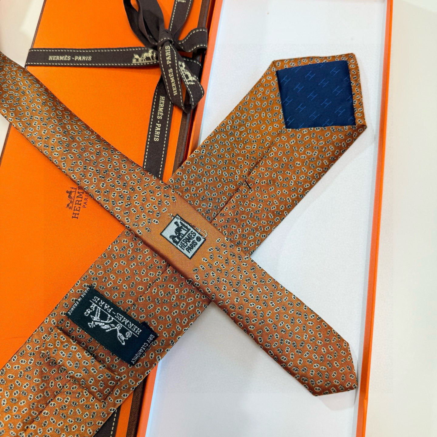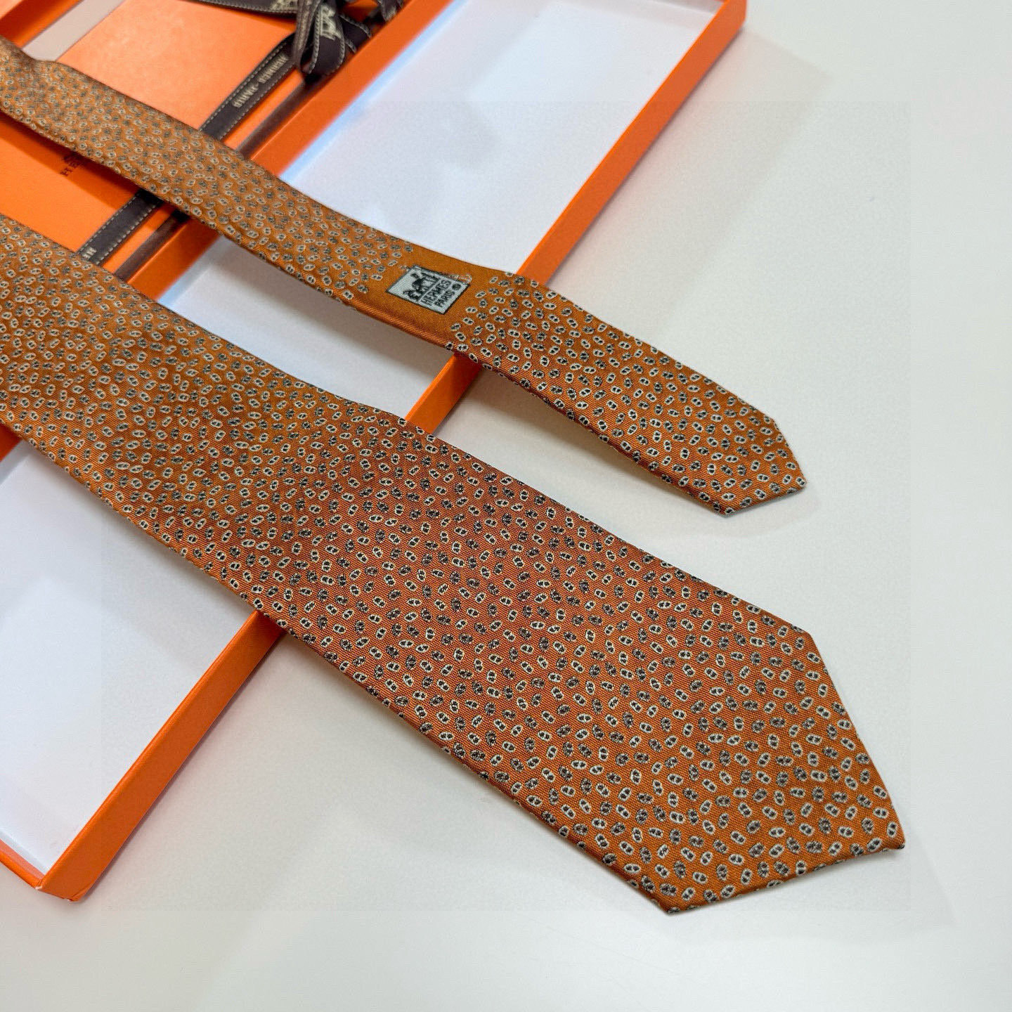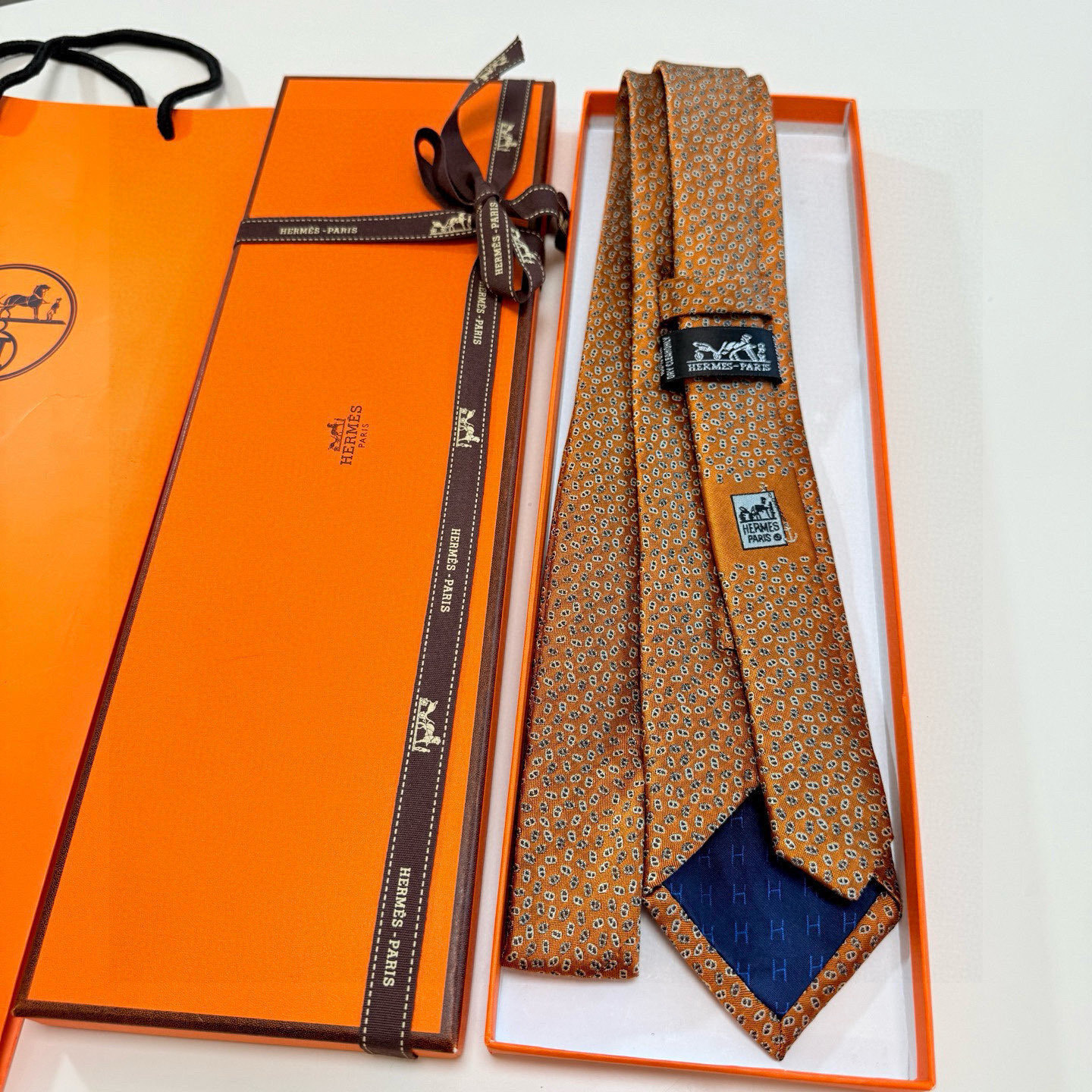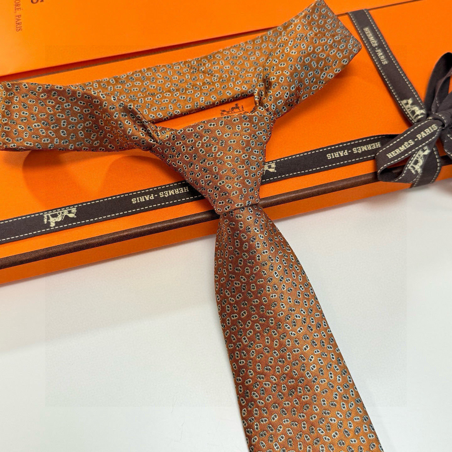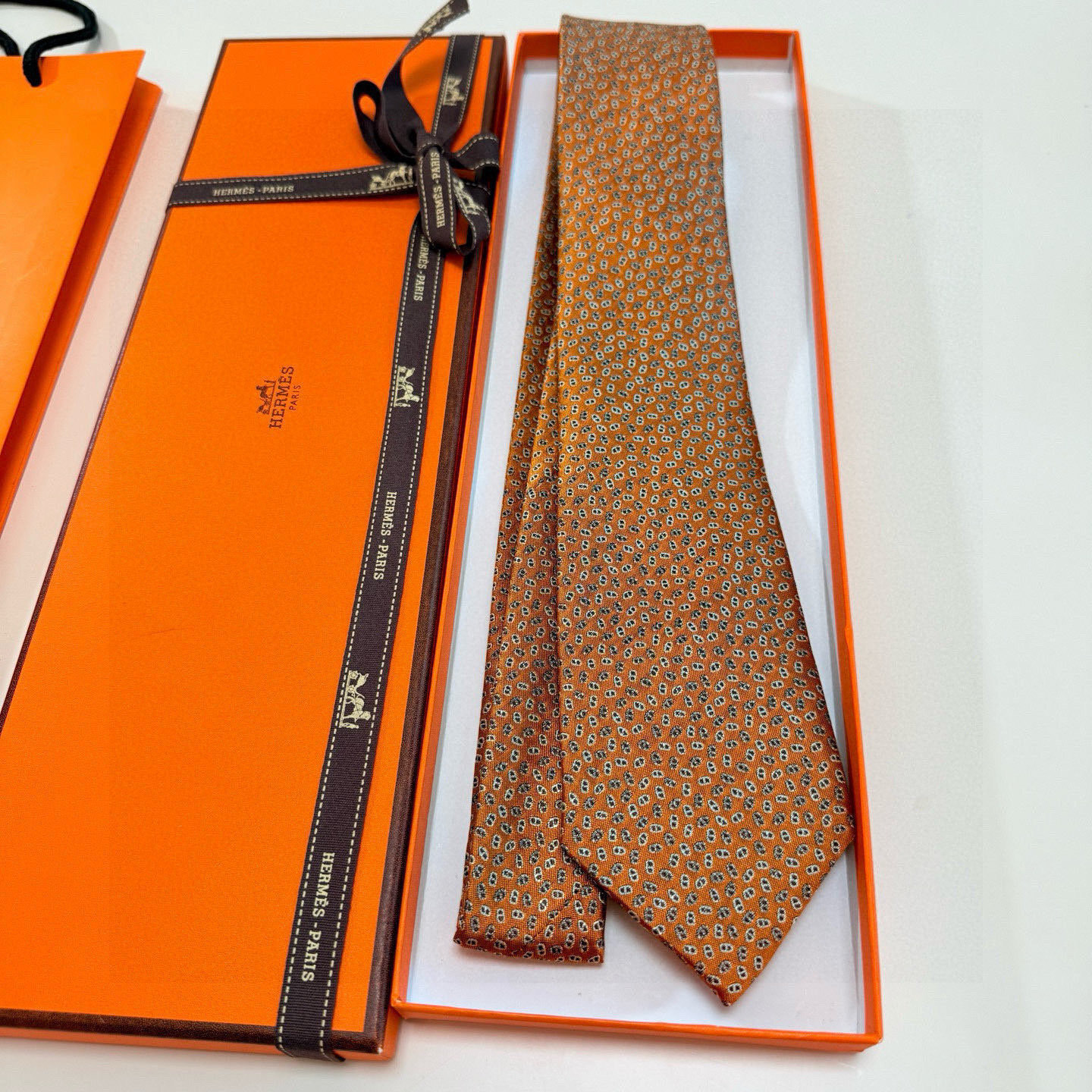 Elevate your style with the Hermès Orange Pattern Silk Tie. Visit our store collection to explore more luxury accessories. Discover more about silk ties on product background on Wikipedia.