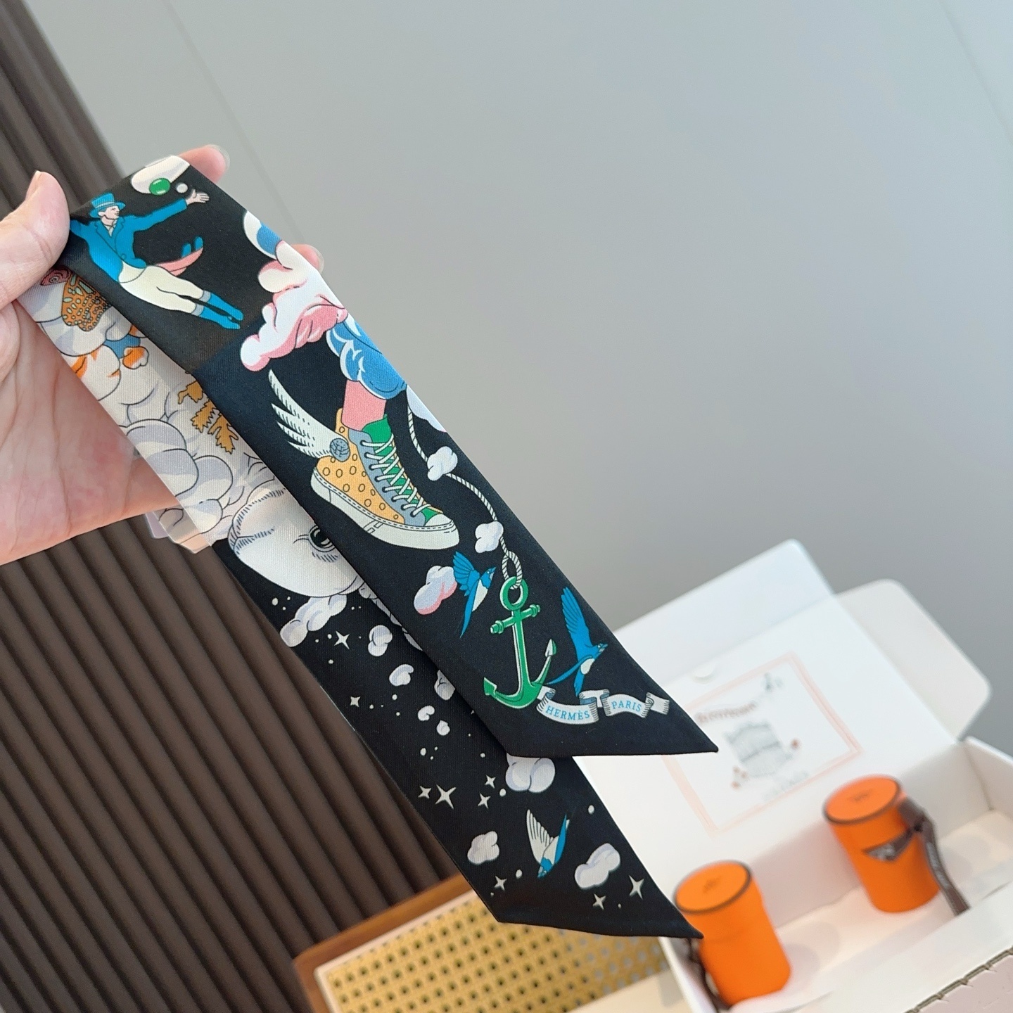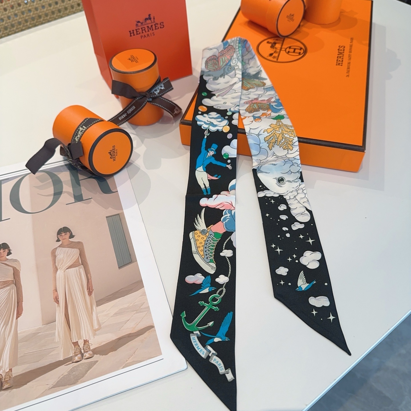 This stunning twilly is made from 100% high-quality silk, ensuring a soft and luxurious feel against your skin. The black background provides a striking contrast to the vibrant, space-themed derby design. The design features whimsical elements such as flying sneakers, anchors, stars, and clouds, all rendered in a playful and artistic style. Each detail is meticulously printed, showcasing Hermès' commitment to craftsmanship and quality. The twilly measures approximately 5 cm x 86 cm, making it the perfect size to wear around your neck, wrist, or even as an embellishment on your handbag. The edges are carefully hand-rolled, adding a touch of refinement and durability to the scarf.