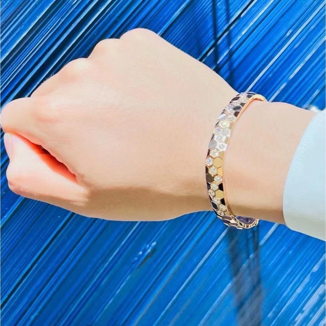 Crafted from the finest materials, this bracelet boasts exceptional durability and a radiant shine. The intricate honeycomb pattern, set with shimmering diamonds, catches the light from every angle, creating a mesmerizing display of brilliance. Its smooth, polished finish ensures a comfortable fit for all-day wear.