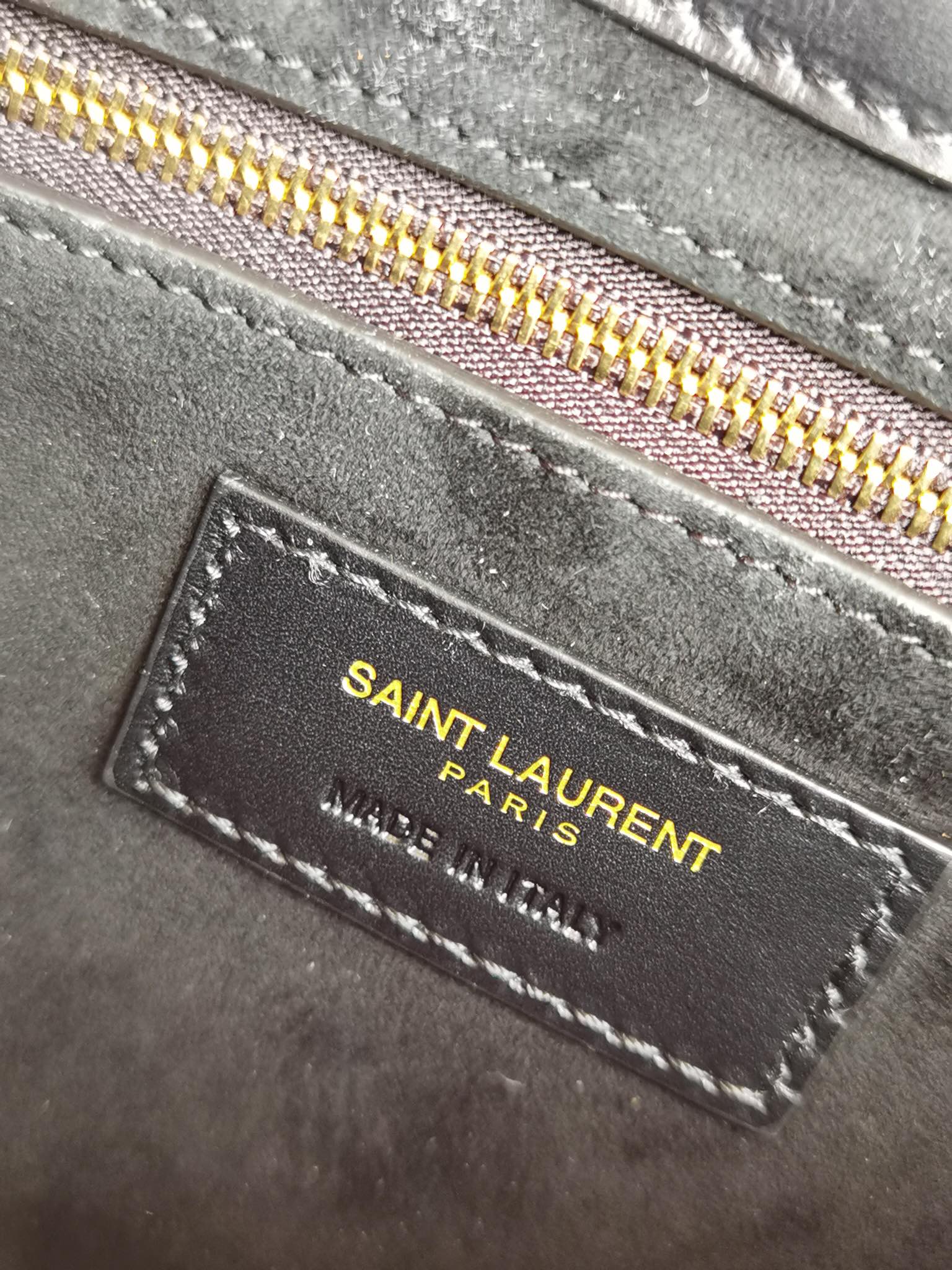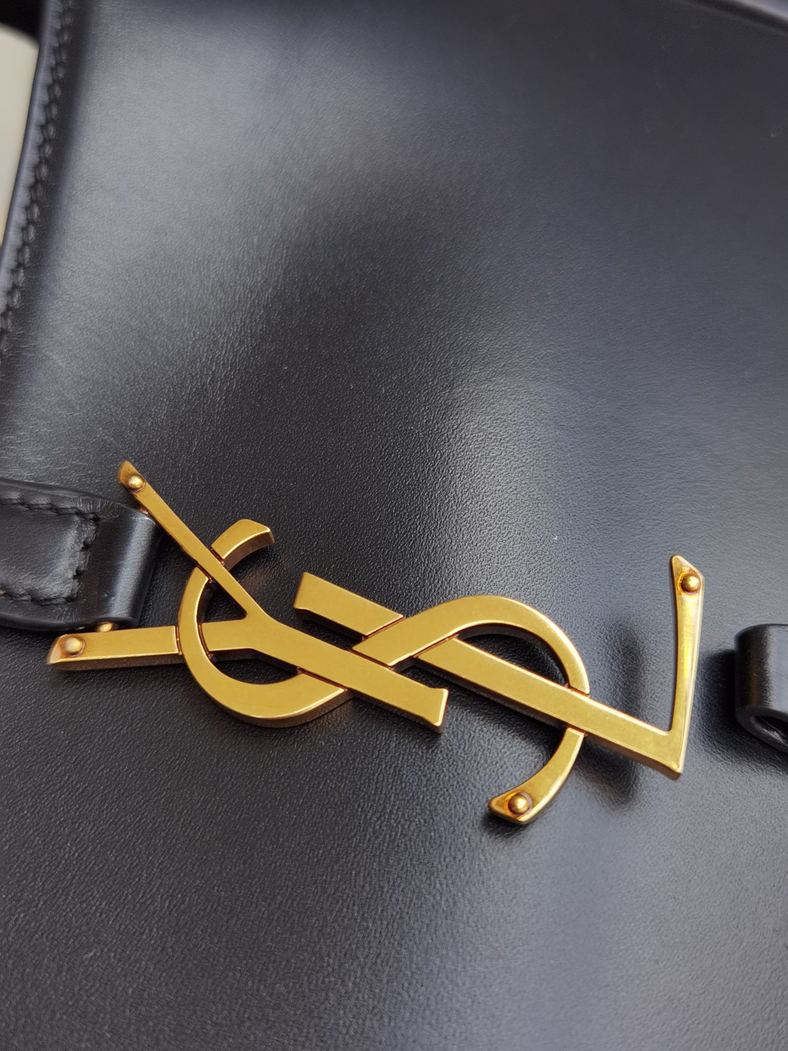 The gold-tone hardware complements the black leather beautifully, adding a touch of glamour and sophistication. The iconic YSL logo is prominently displayed on the front of the bag, showcasing its designer pedigree and making a bold fashion statement.