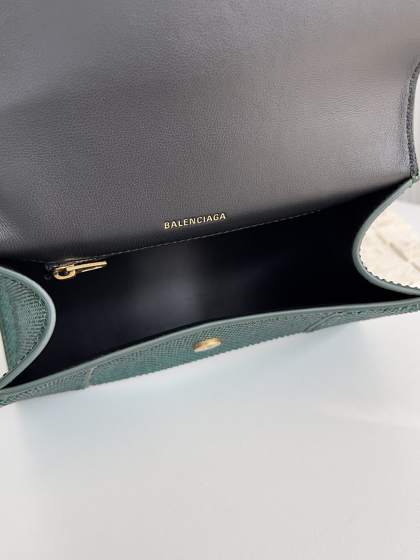 Q: What is the interior of the Balenciaga Green Rhinestone Hourglass Bag like?