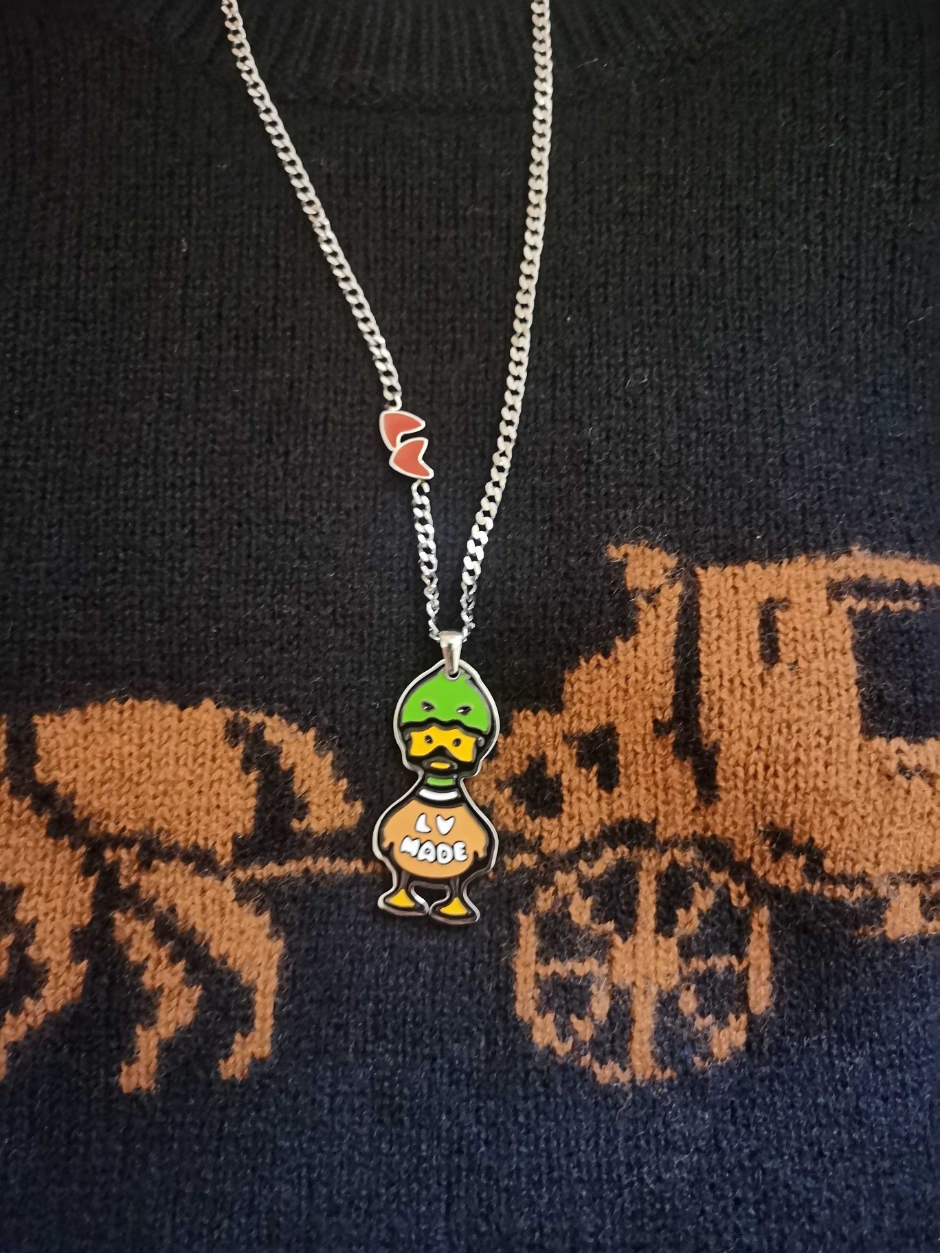 The duck pendant is meticulously designed with vibrant colors, enhancing its appeal. The silver chain complements the pendant beautifully, providing a comfortable and secure fit. This necklace is not just a piece of jewelry; it's a statement of individuality and style. The LV Silver Duck Pendant Necklace is a true reflection of Louis Vuitton's commitment to innovation and creativity. The pendant features 'LV Made' lettering adding a touch of exclusivity to the design.