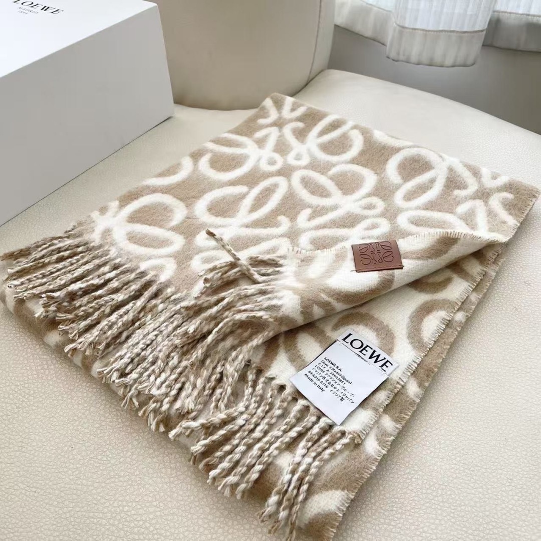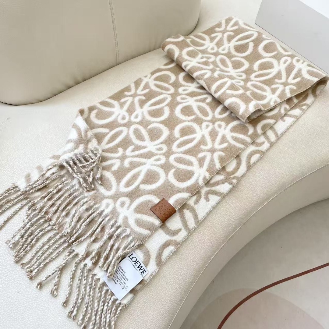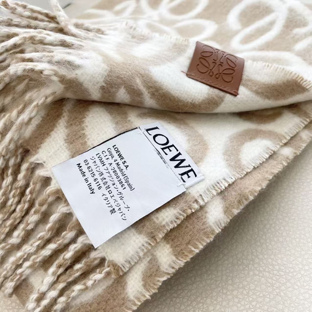 A: The scarf is generously sized to provide ample coverage and styling options. Please refer to the product specifications on our store collection for the exact dimensions. The generous size of the **Loewe Anagram Fringed Wool Scarf - Beige & Black** allows for versatile styling.