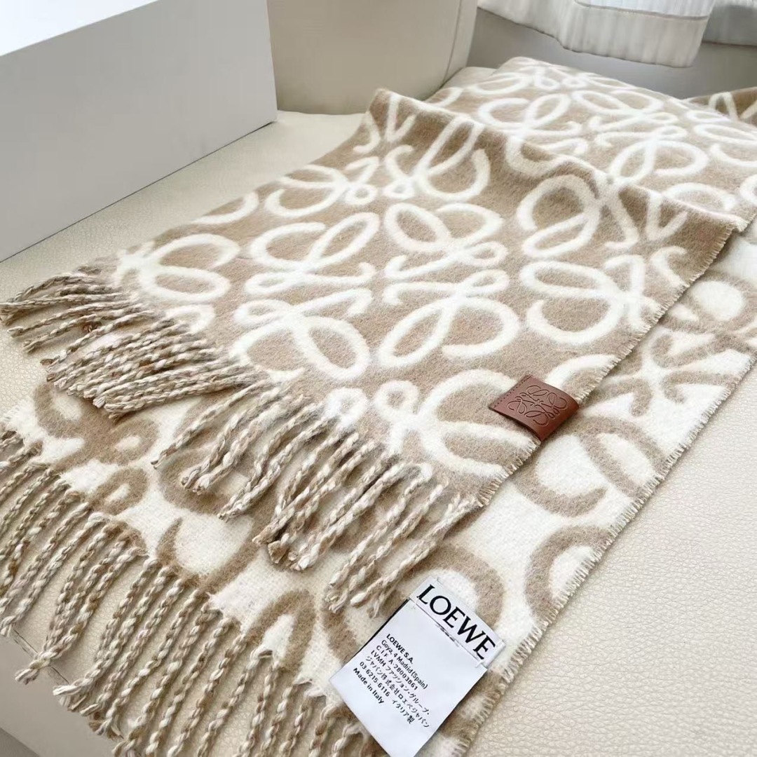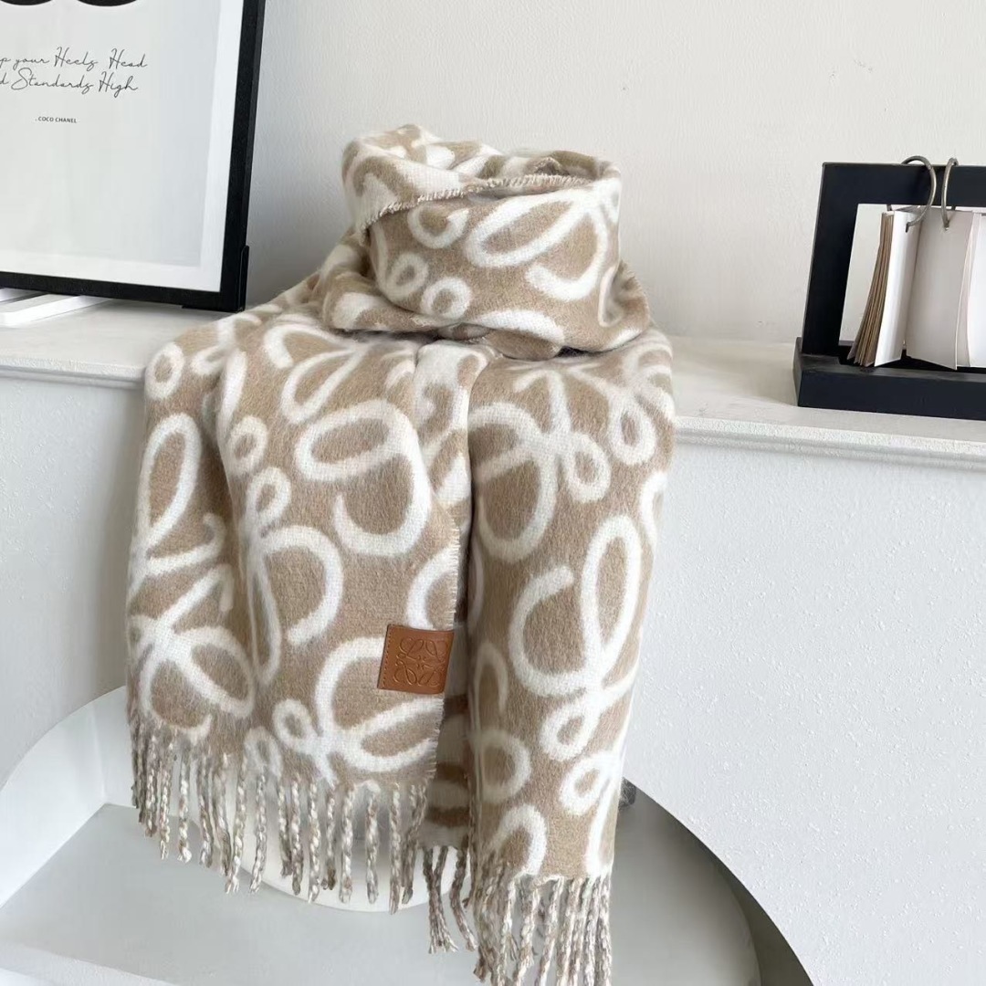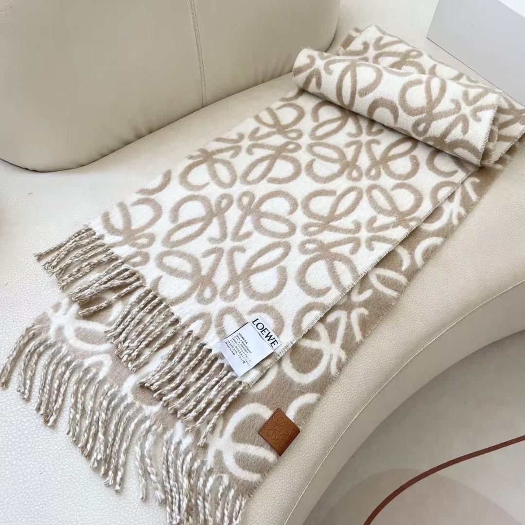 A: The scarf is generously sized to provide ample coverage and styling options. Please refer to the product specifications on our store collection for the exact dimensions. The generous size of the **Loewe Anagram Fringed Wool Scarf - Beige & Black** allows for versatile styling.
