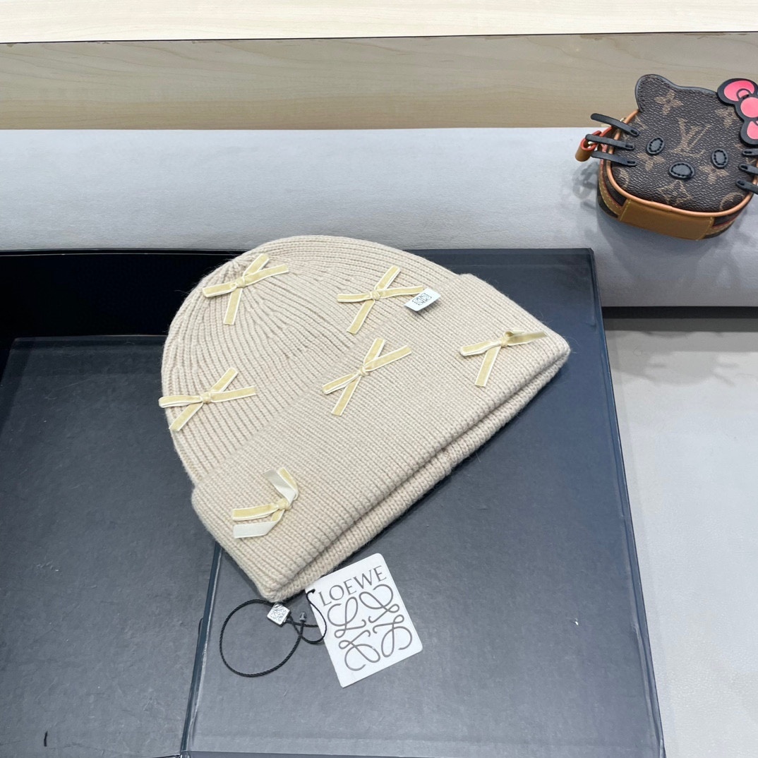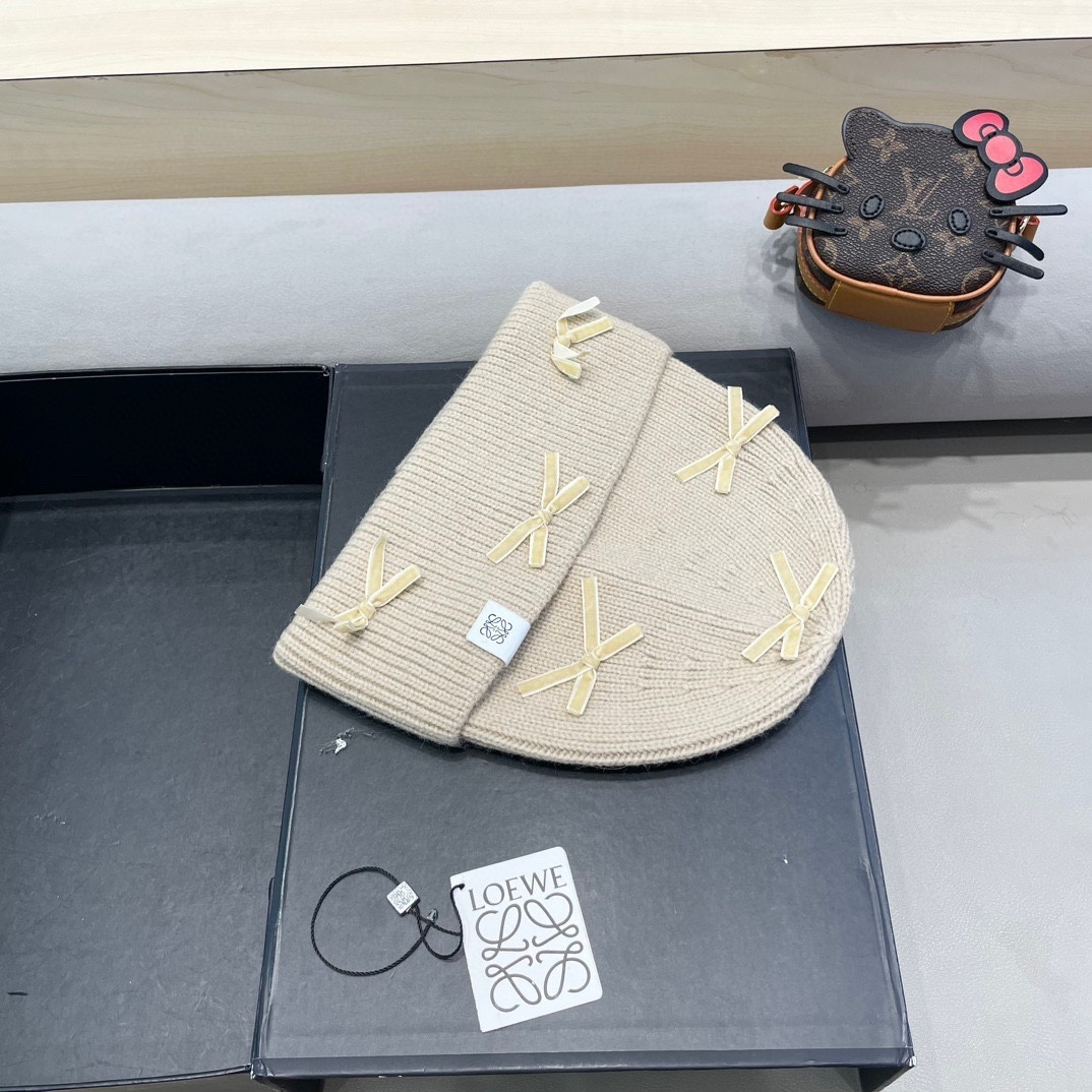 - Introducing the Loewe Beige Wool Beanie with Ribbon Accents