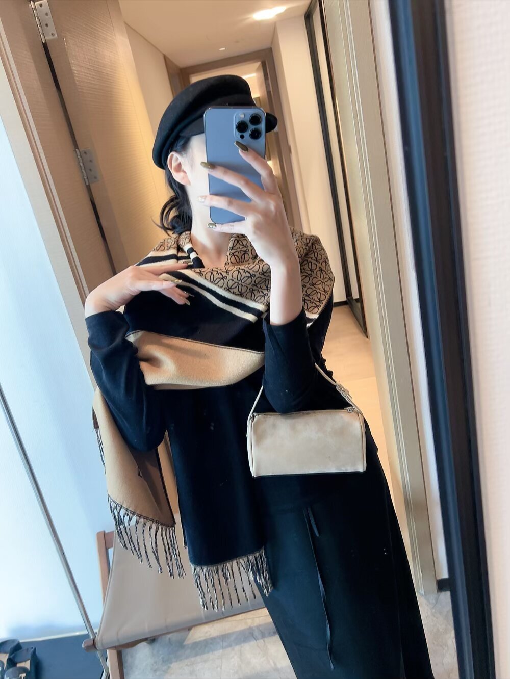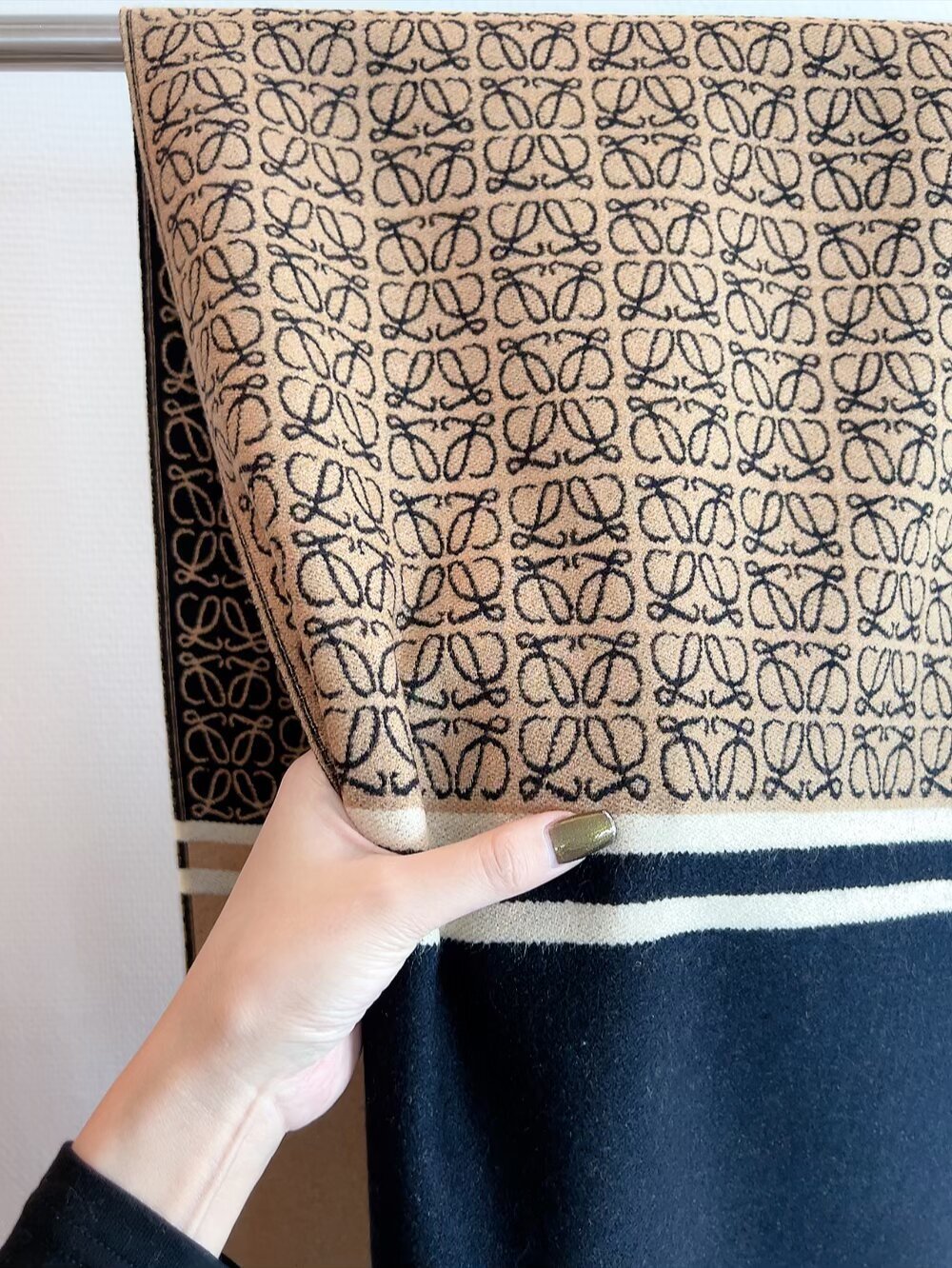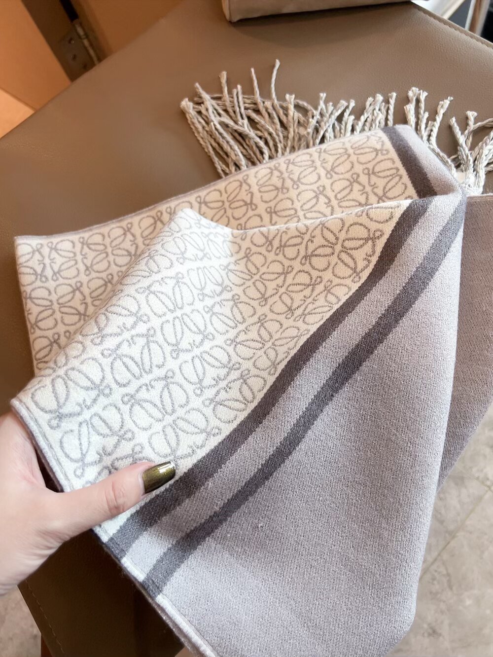 Loewe Grey Jacquard Scarf - Wrap yourself in luxury with the Loewe Grey Logo Jacquard Scarf. This exquisite accessory is crafted from a premium wool blend, offering unparalleled softness and warmth. The subtle grey hue and intricate logo jacquard pattern make it a versatile addition to any wardrobe, perfect for adding a touch of sophistication to both casual and formal ensembles. The Loewe Grey Logo Jacquard Scarf is more than just an accessory; it's a statement of refined taste and timeless elegance. The scarf’s design features the iconic Loewe logo woven meticulously into the fabric, creating a subtle yet distinctive pattern that catches the eye without being overpowering. The fringed edges add a touch of playful charm, while the generous size allows for versatile styling options – drape it over your shoulders, wrap it around your neck, or even tie it as a headscarf for a chic, bohemian look.
