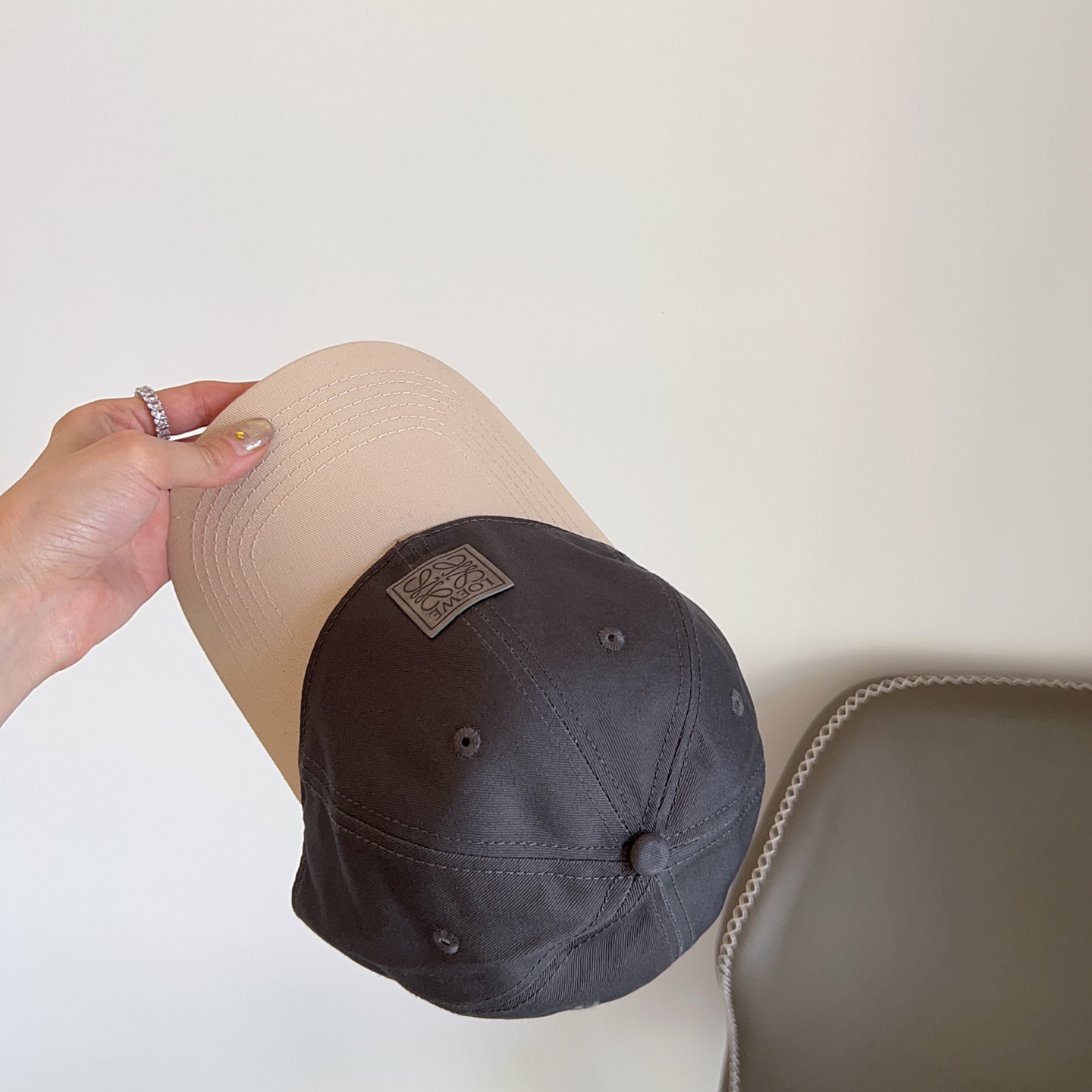 The cap features a sophisticated two-tone color scheme, with a grey crown and a beige brim. This contrasting design adds a touch of modernity and style, making it a standout accessory. The neutral colors are versatile and easy to pair with different outfits.