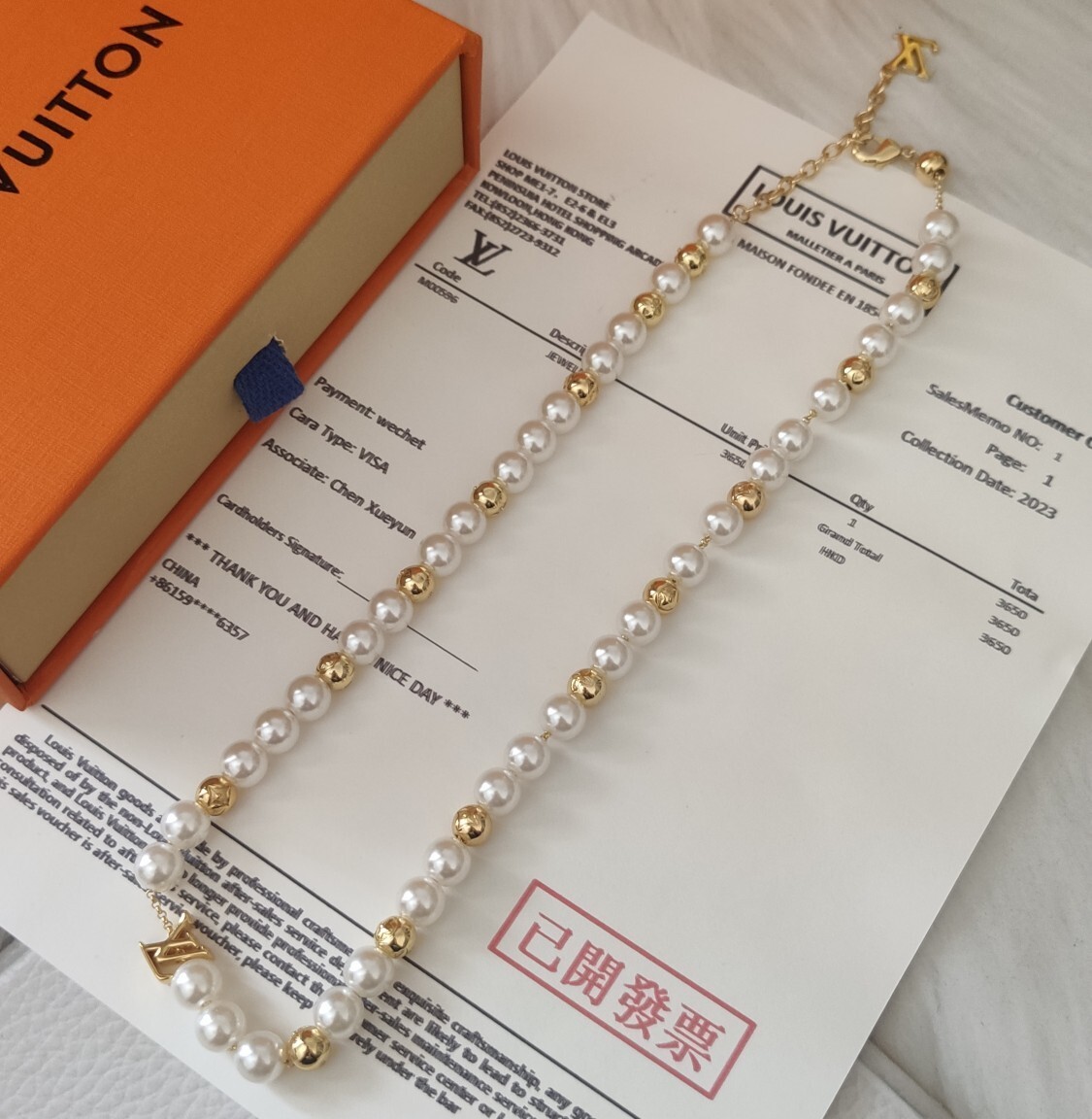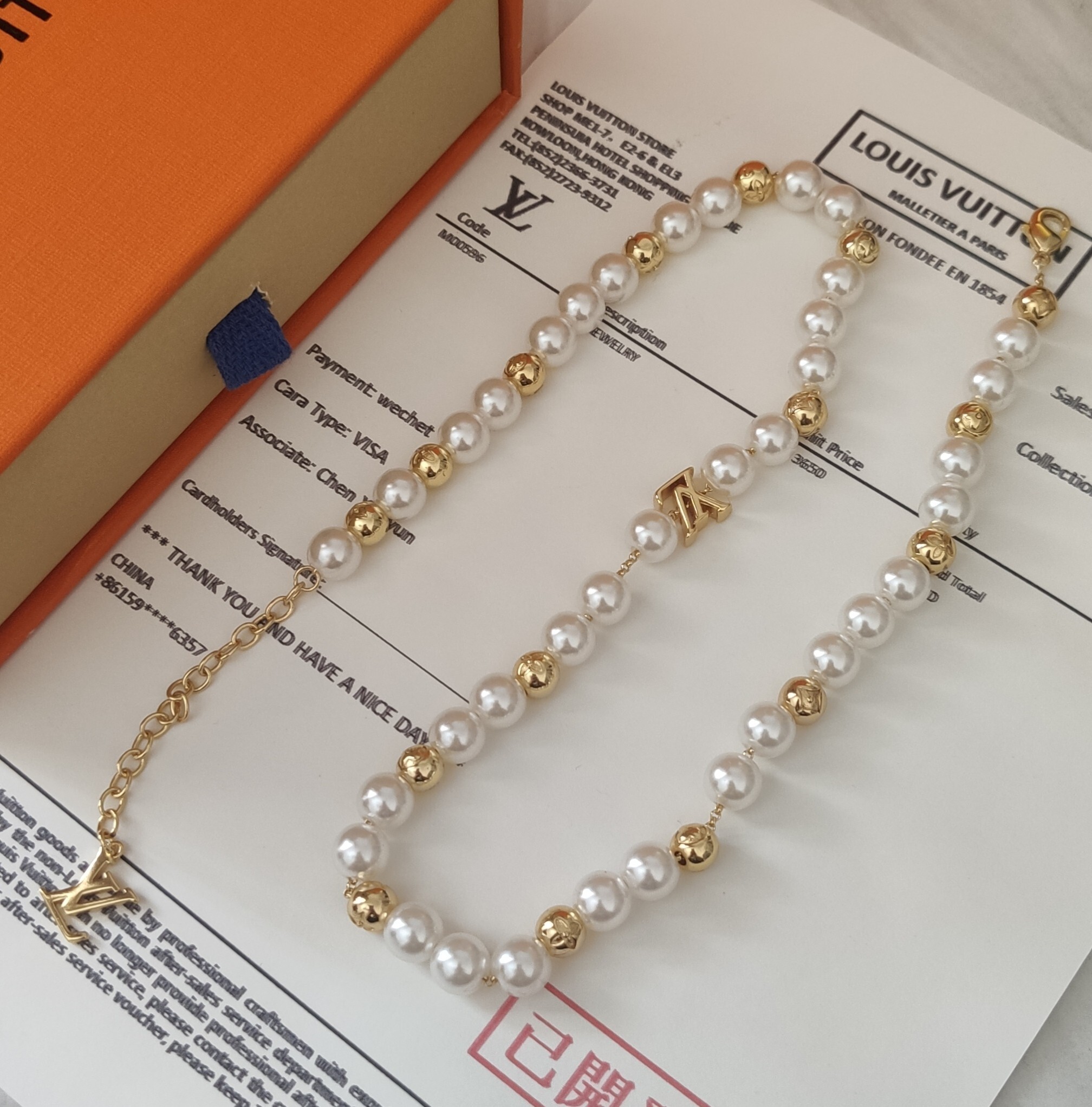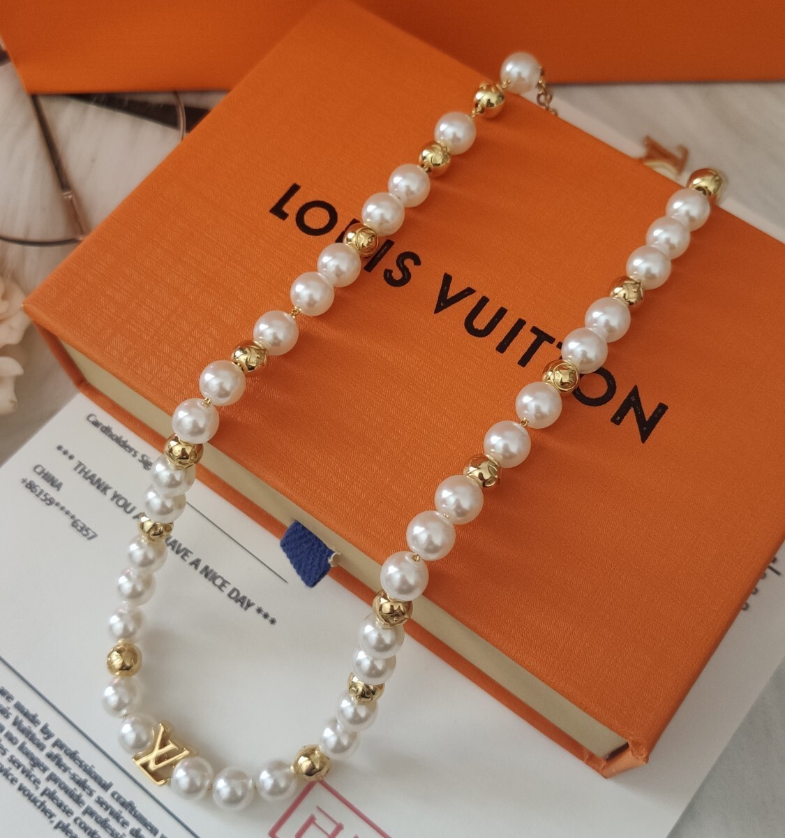 The necklace is made of high-quality pearls, premium metal with a gold finish, and features the iconic Louis Vuitton logo charm.