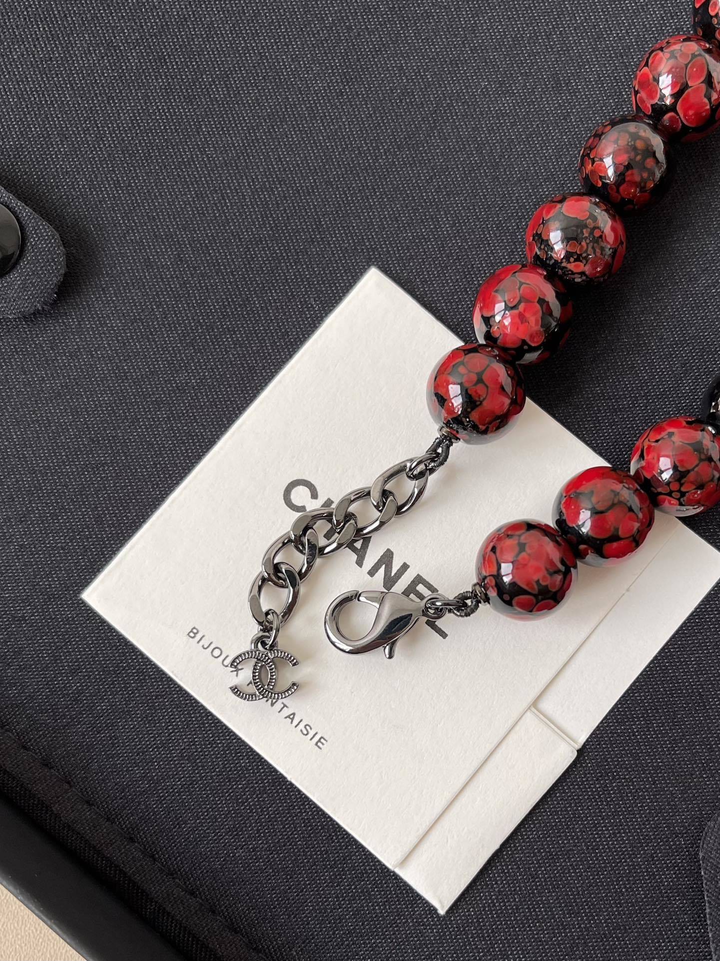 The necklace is primarily made of high-quality red beads, which are carefully selected for their color, size, and luster. The CC logo is typically made of metal, often plated with gold or silver, depending on the design. The clasp is also made of metal, ensuring a secure and durable closure.