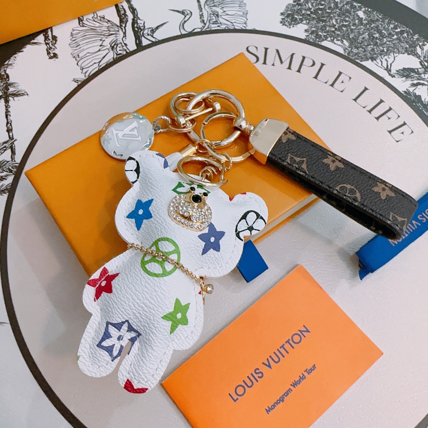A: The keychain is crafted from premium white leather and features gold-tone hardware, including a metal ring, lobster clasp, and chain. The bear is adorned with multicolored LV monogram patterns and a bejeweled collar.