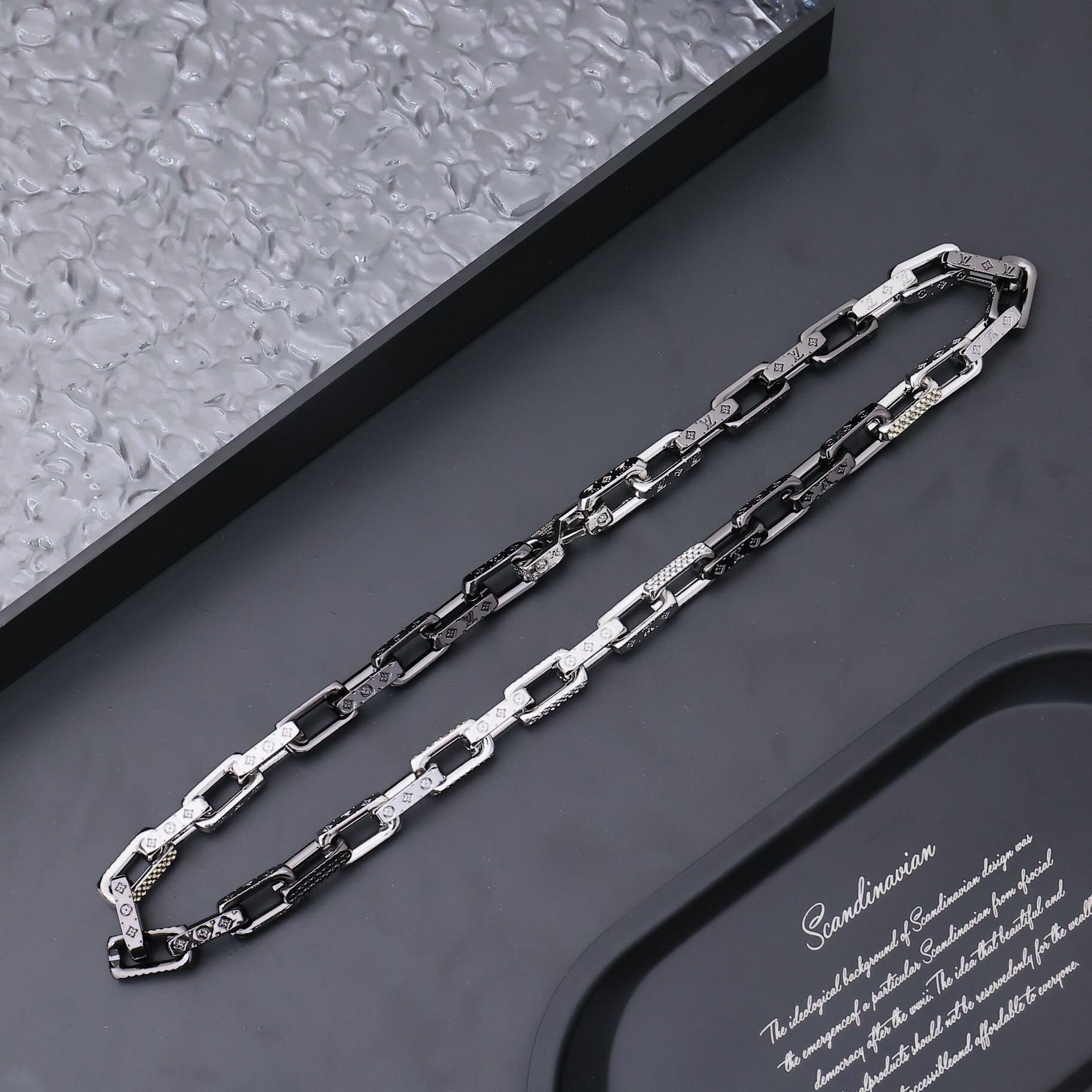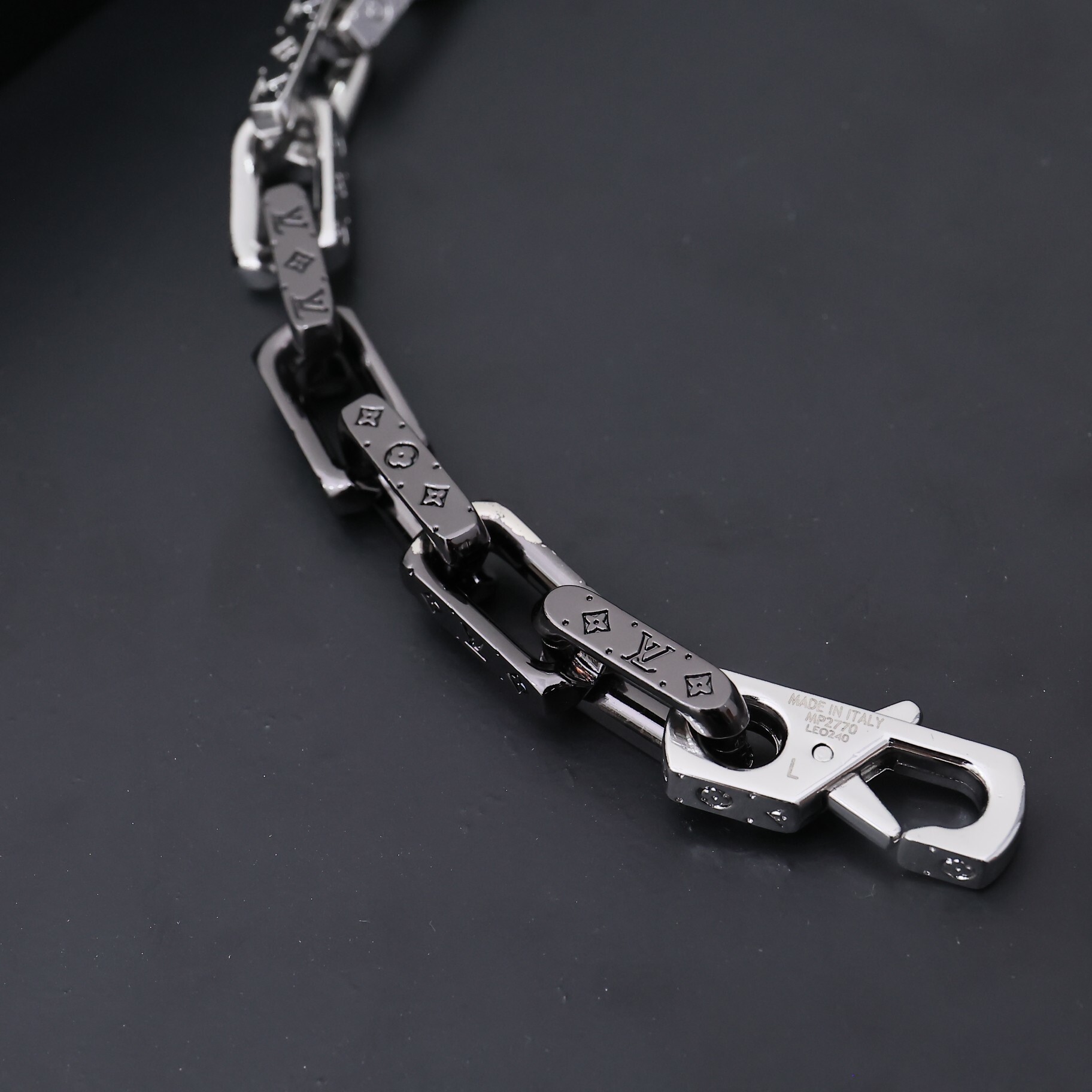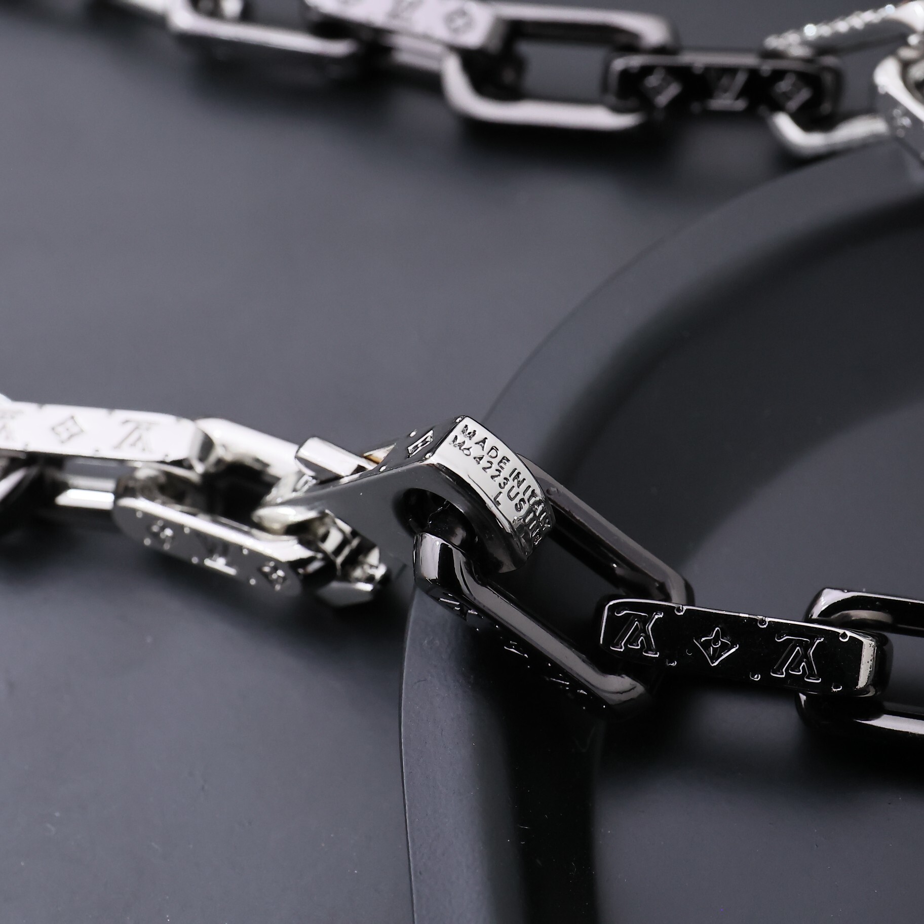 A: The necklace is crafted from high-quality silver-tone metal and features black chain links for a contrasting design. The silver-tone links are engraved with the iconic Louis Vuitton monogram.